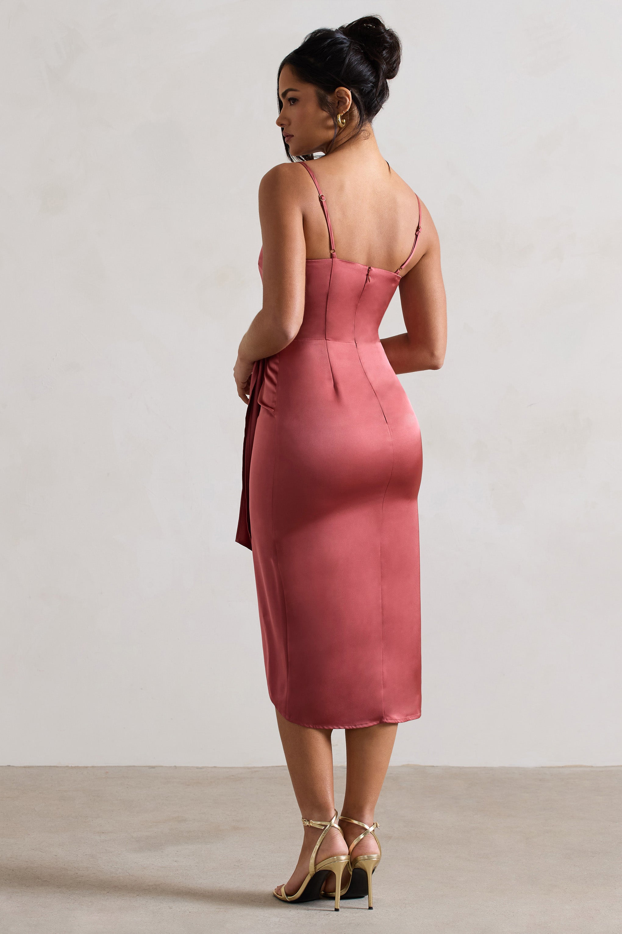 Sabela Rose Pink Satin Wrap Midi Dress With Knot Detail