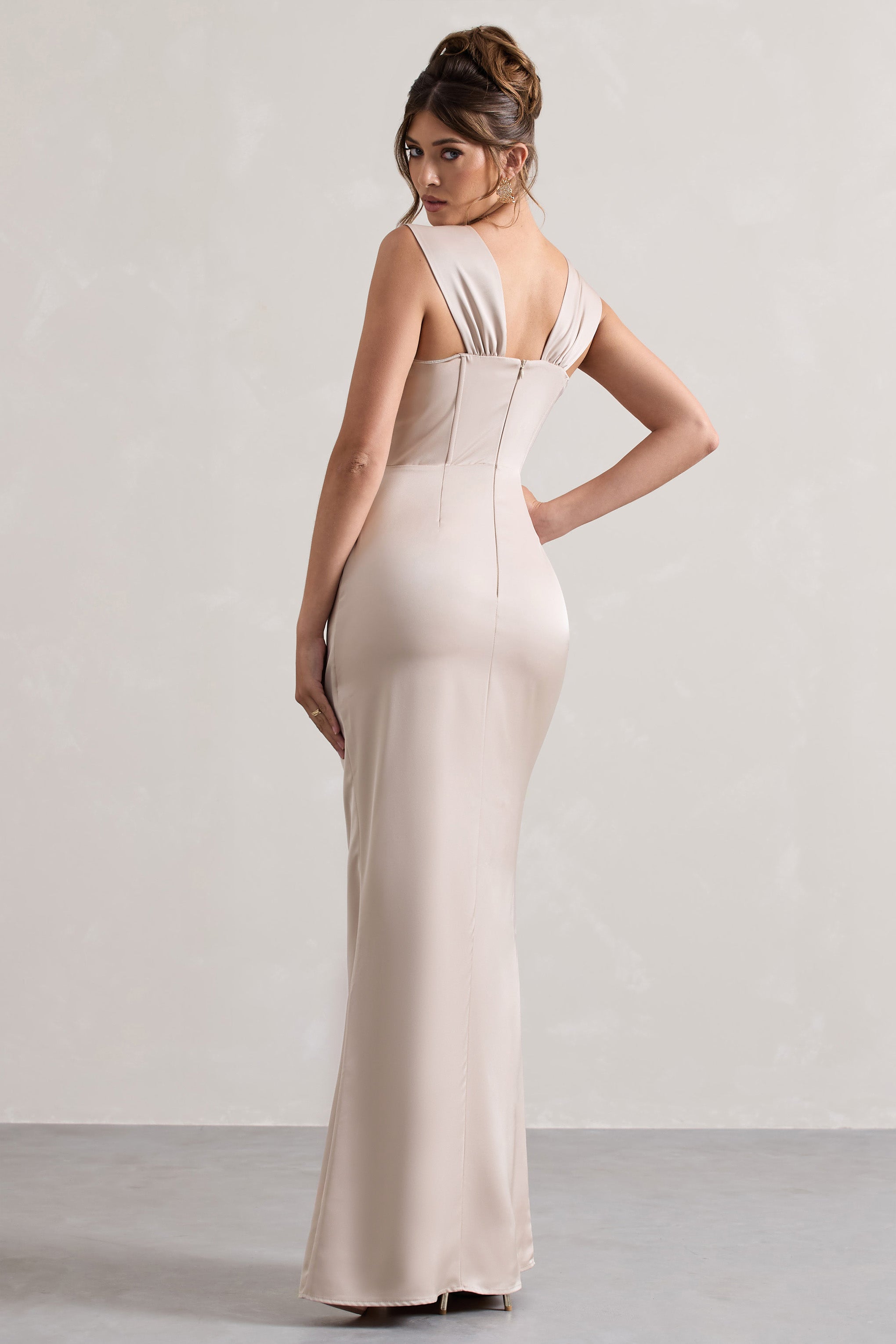 A Romantic Champagne Satin Corset Wrap Maxi Dress