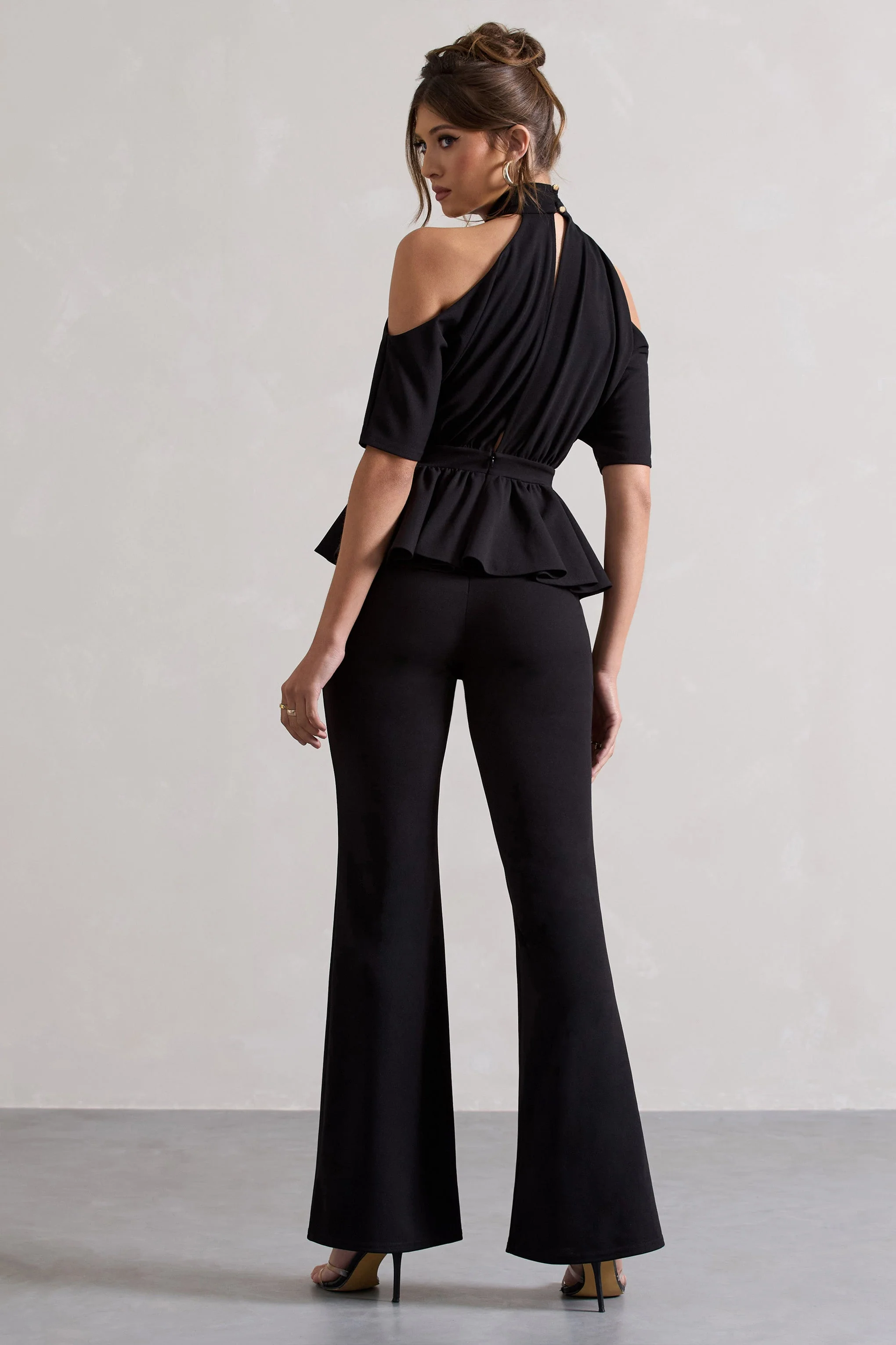 Black High-Neck Cut-Out Jumpsuit With Peplum Waist