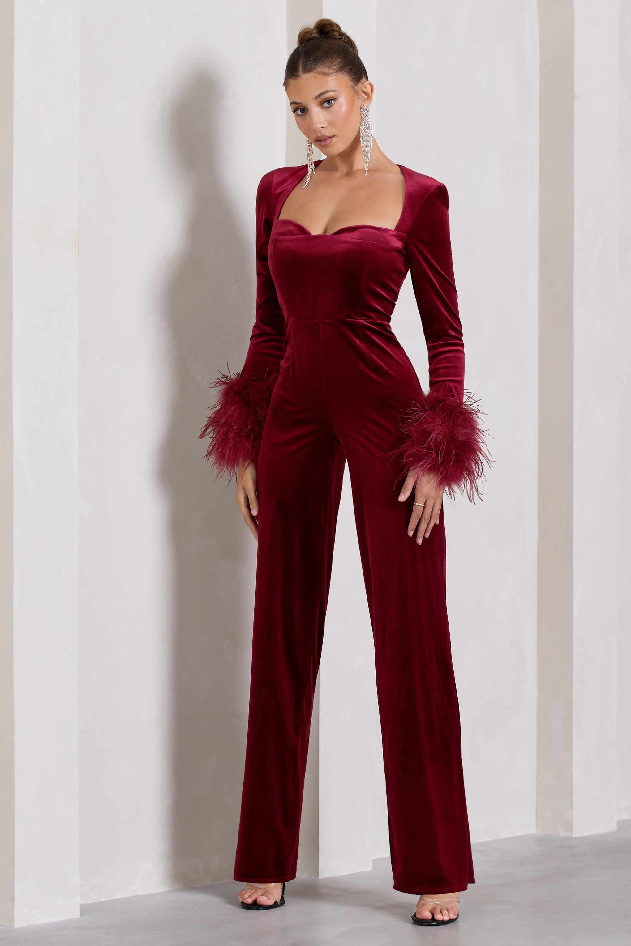 Trailblazer Berry Red Velvet Long-Sleeved Jumpsuit With Feather Cuffs