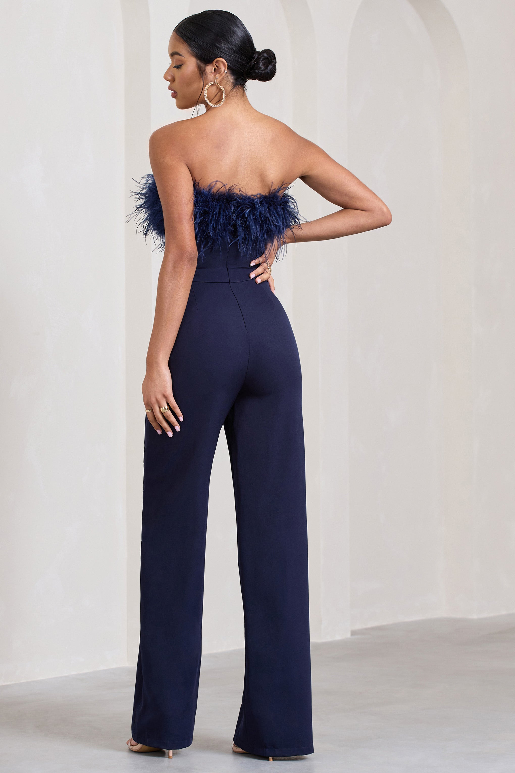 First Class Navy Bandeau Feather Wide Leg Jumpsuit