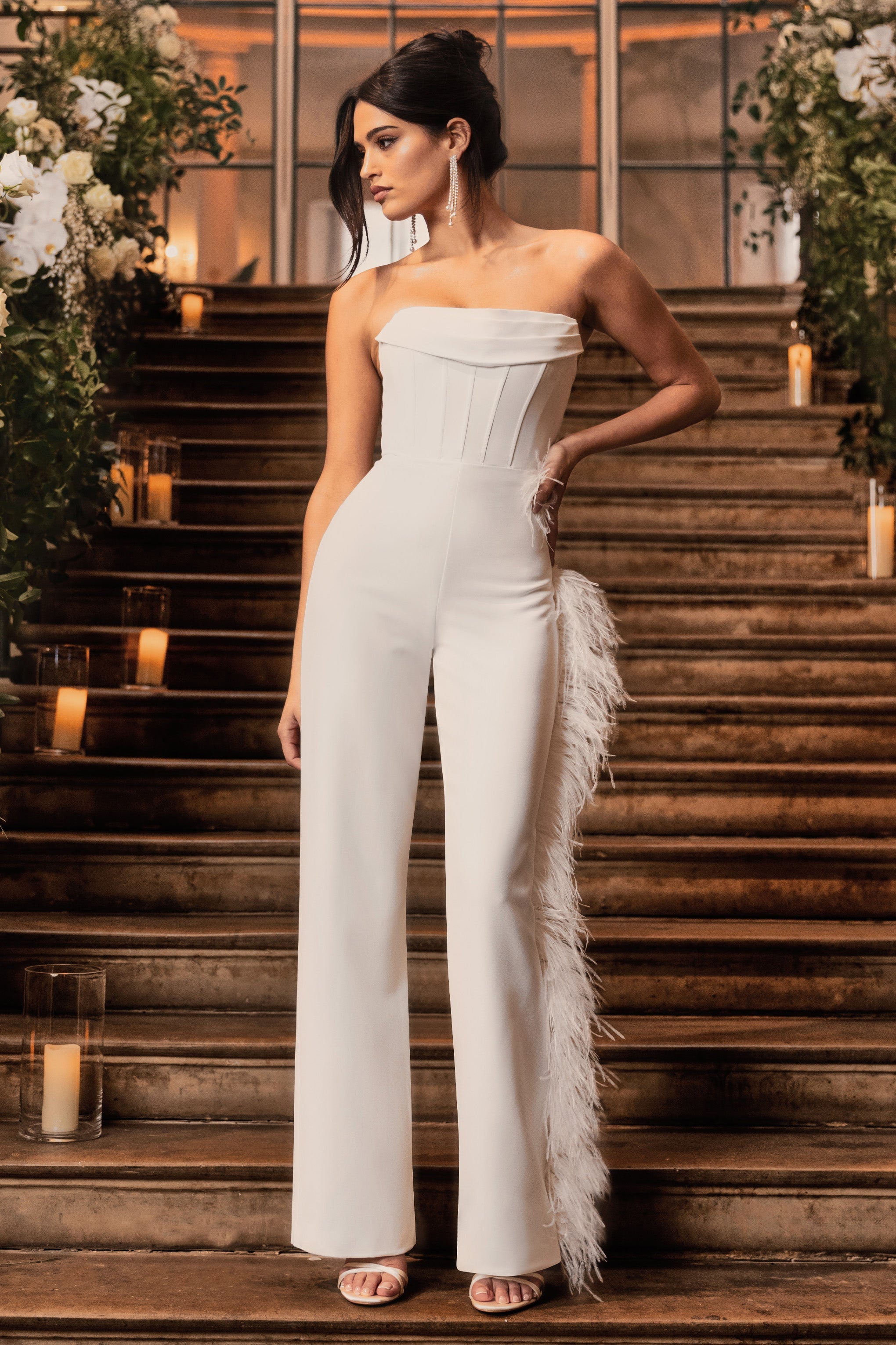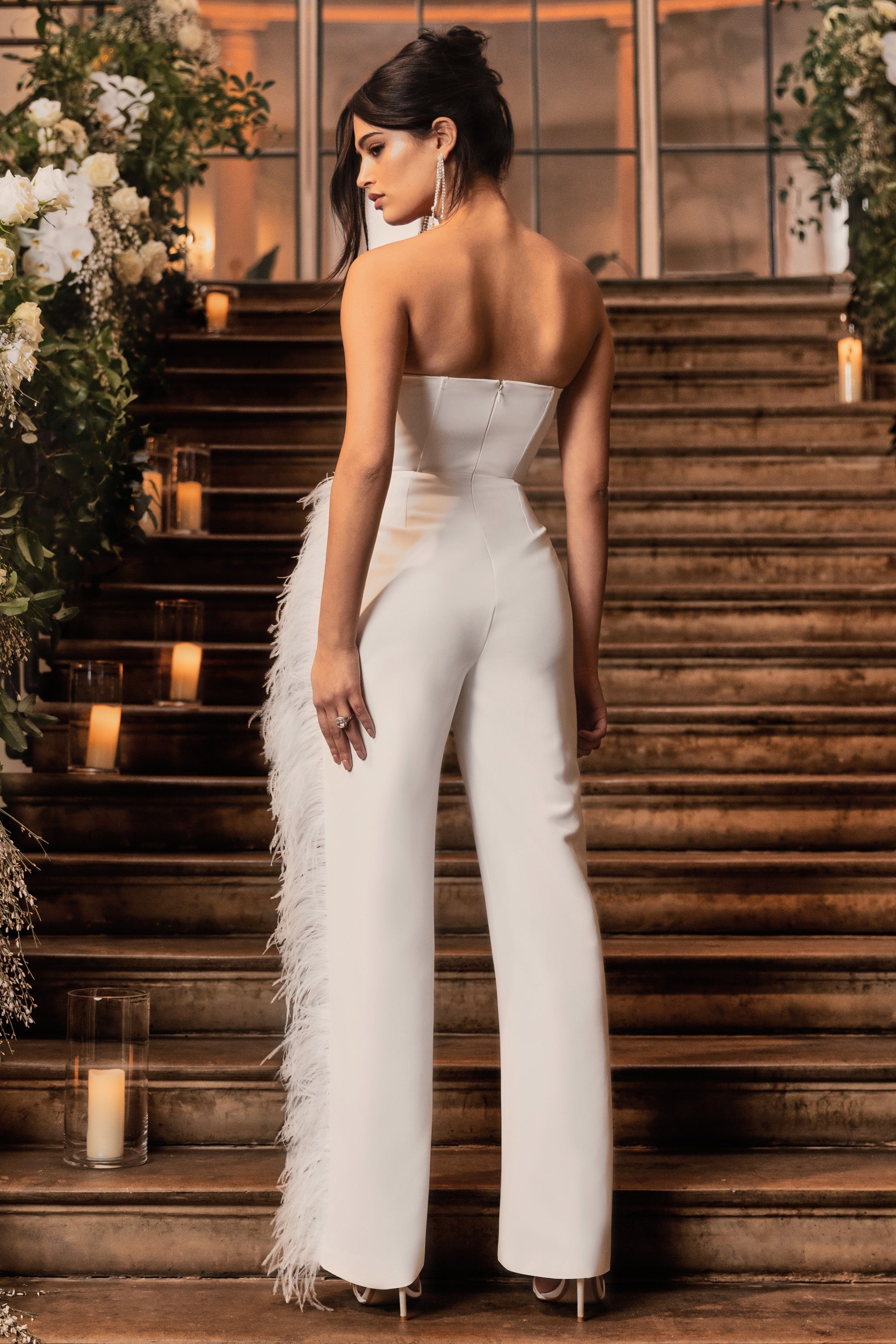 Topic Of Talk White Strapless Bandeau Wide-Leg Jumpsuit With Feather Trim