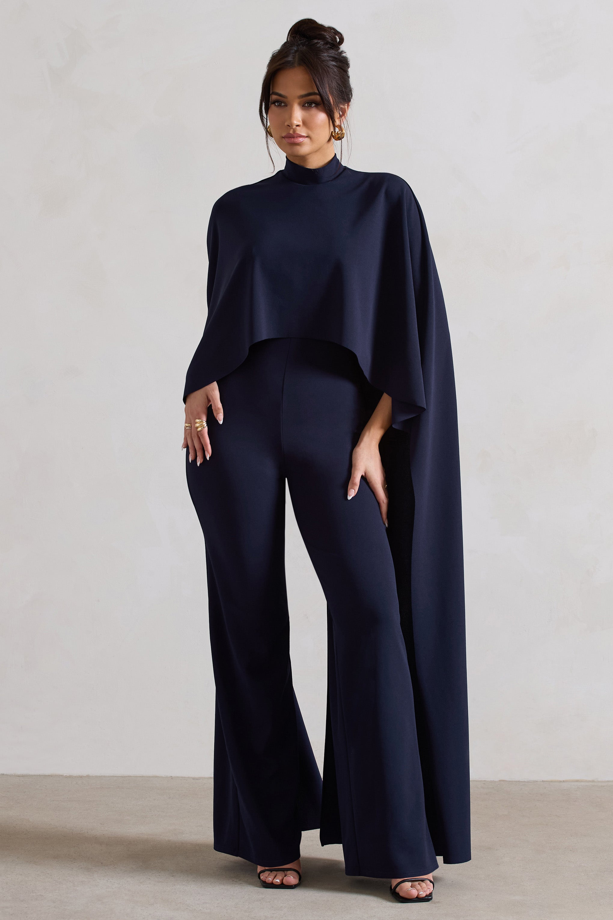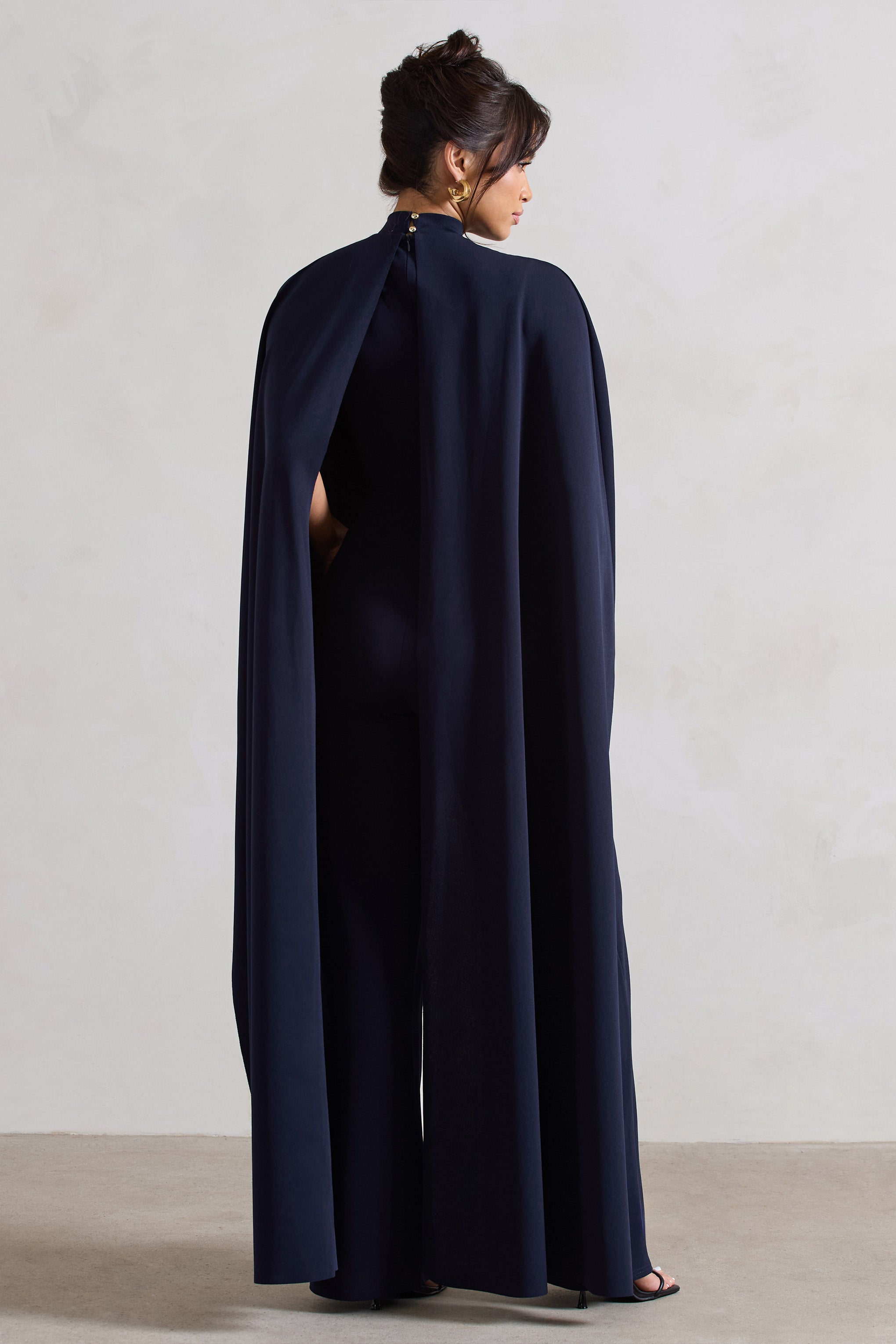 Indra Navy High-Neck Wide-Leg Cape Jumpsuit