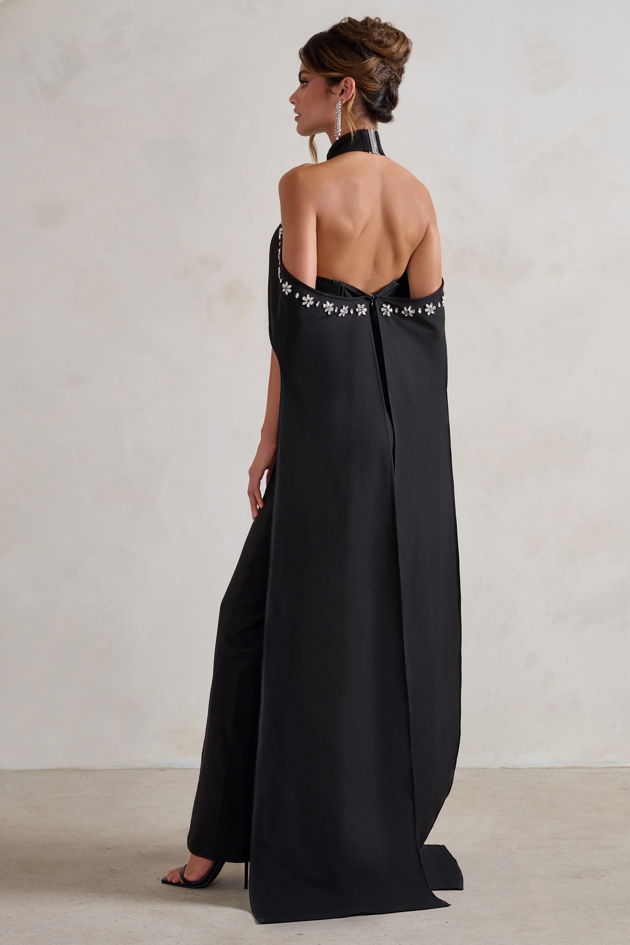 Angel Black High Neck Jumpsuit with Cold Shoulder Cape Sleeves