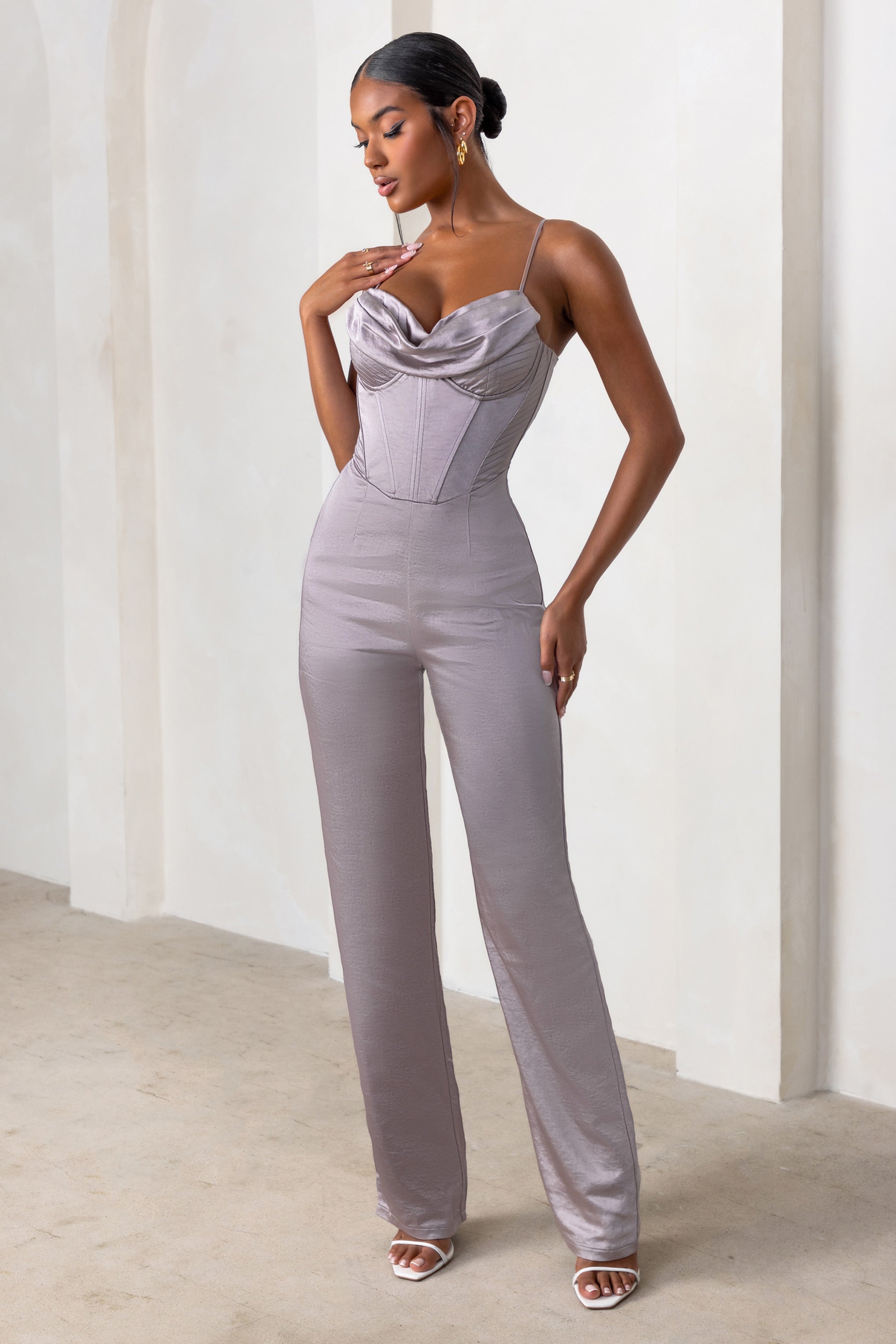 Reserved Destination Mink Satin Pleated Front Drape Corset Straight Leg Jumpsuit
