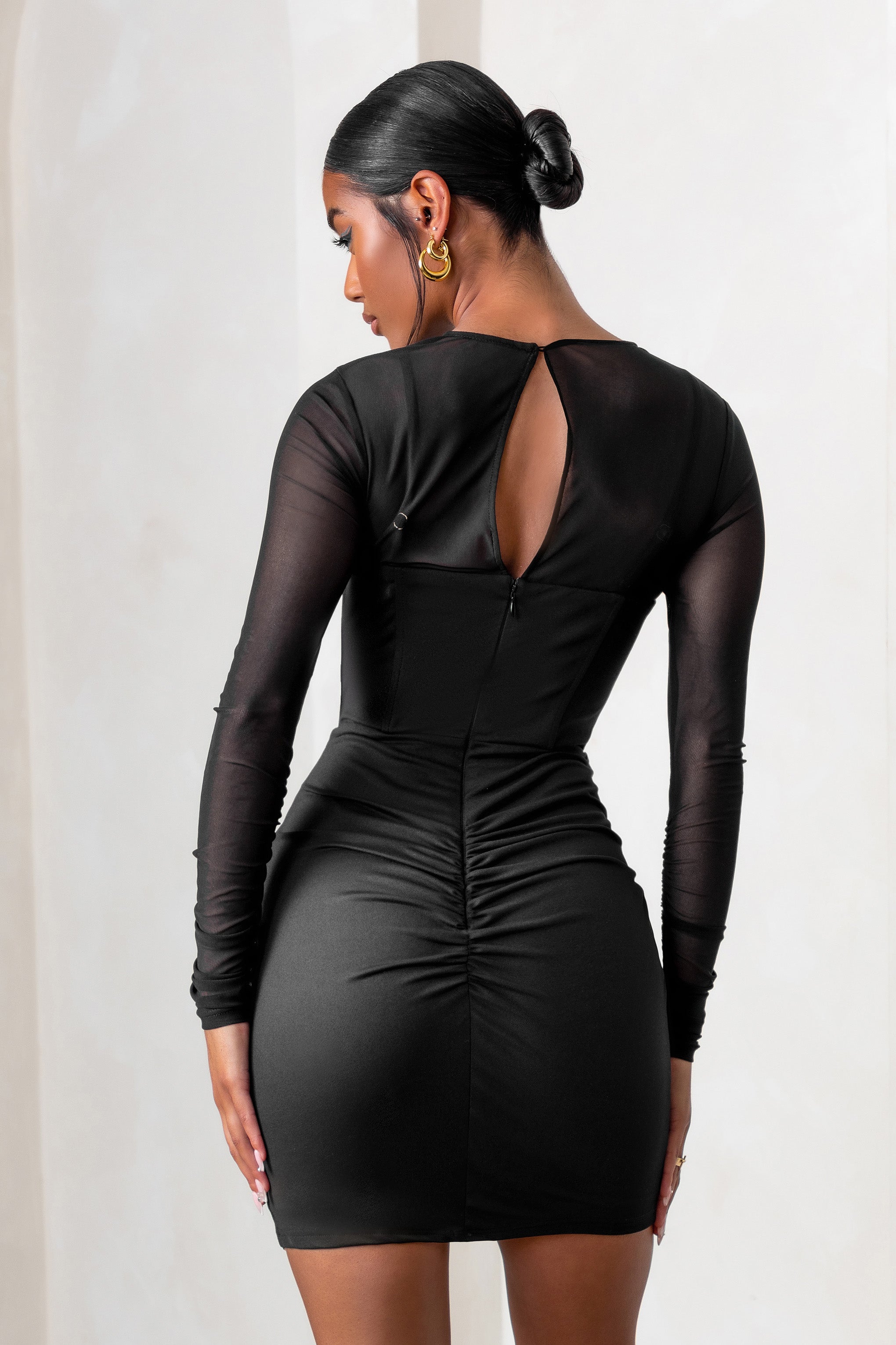 Tana Black Ruched Bodycon Long Sleeve Cut-Out Mini Dress