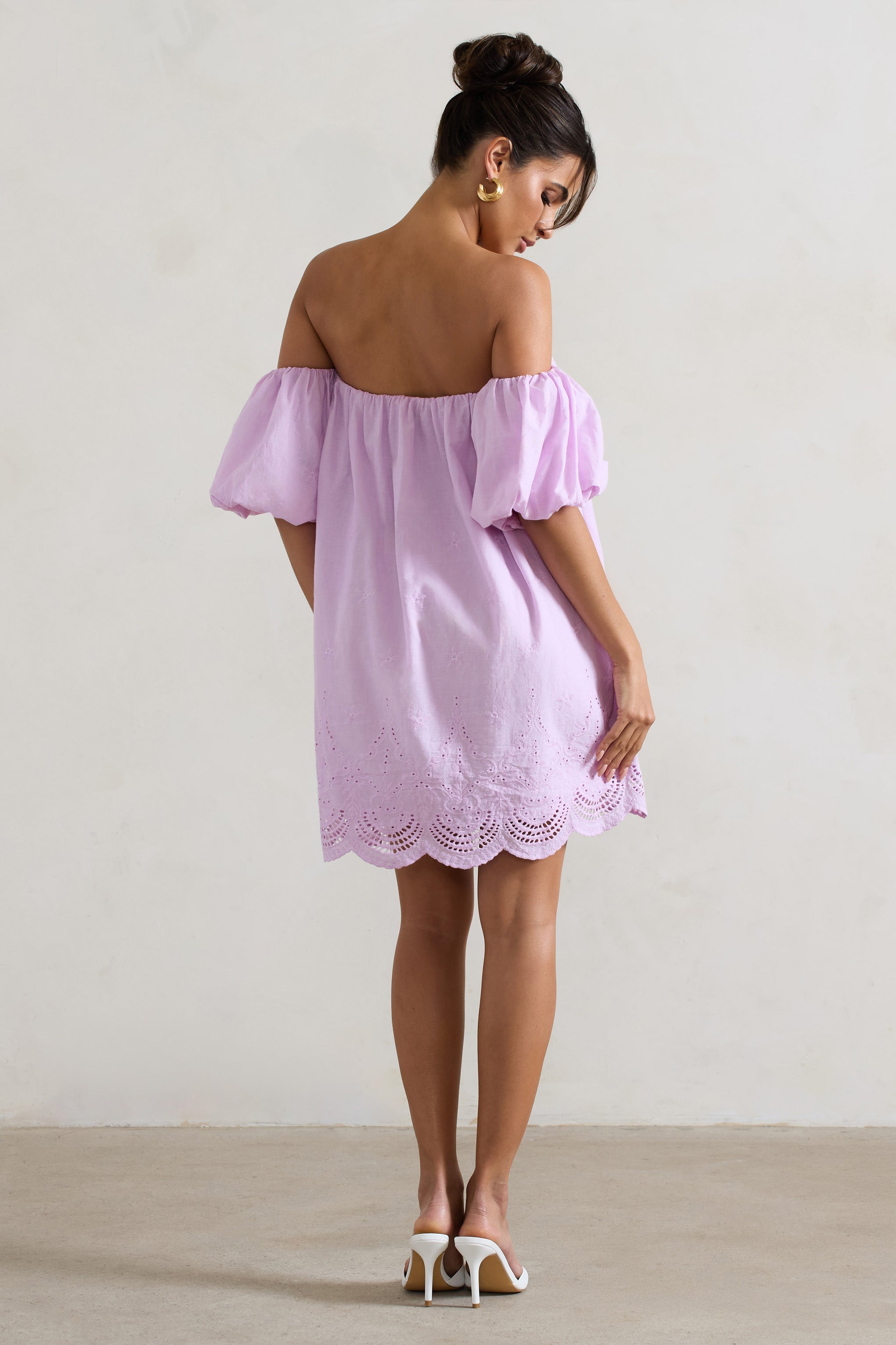 Wendy Lilac Poplin Bardot Lace Trim Smock Mini Dress