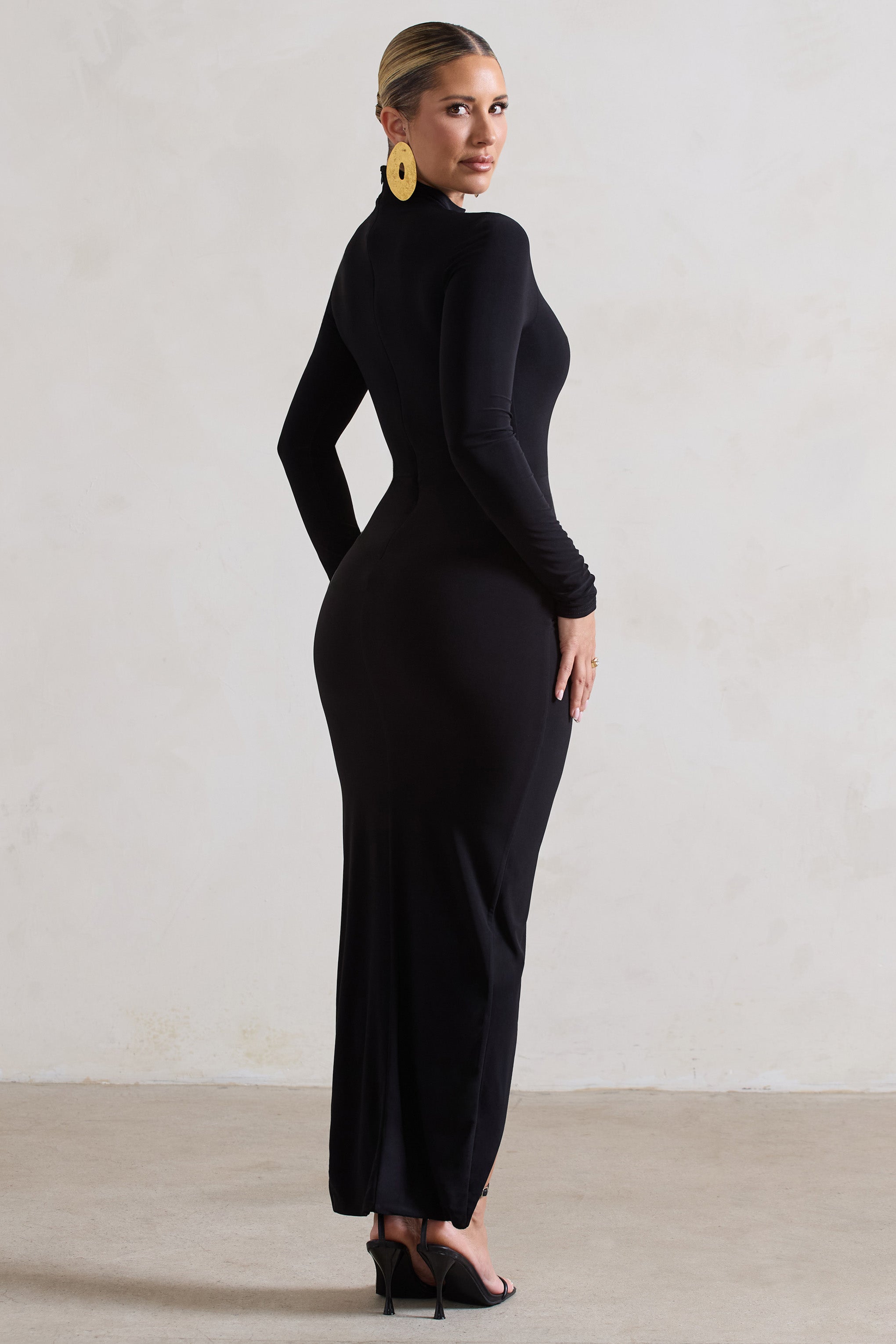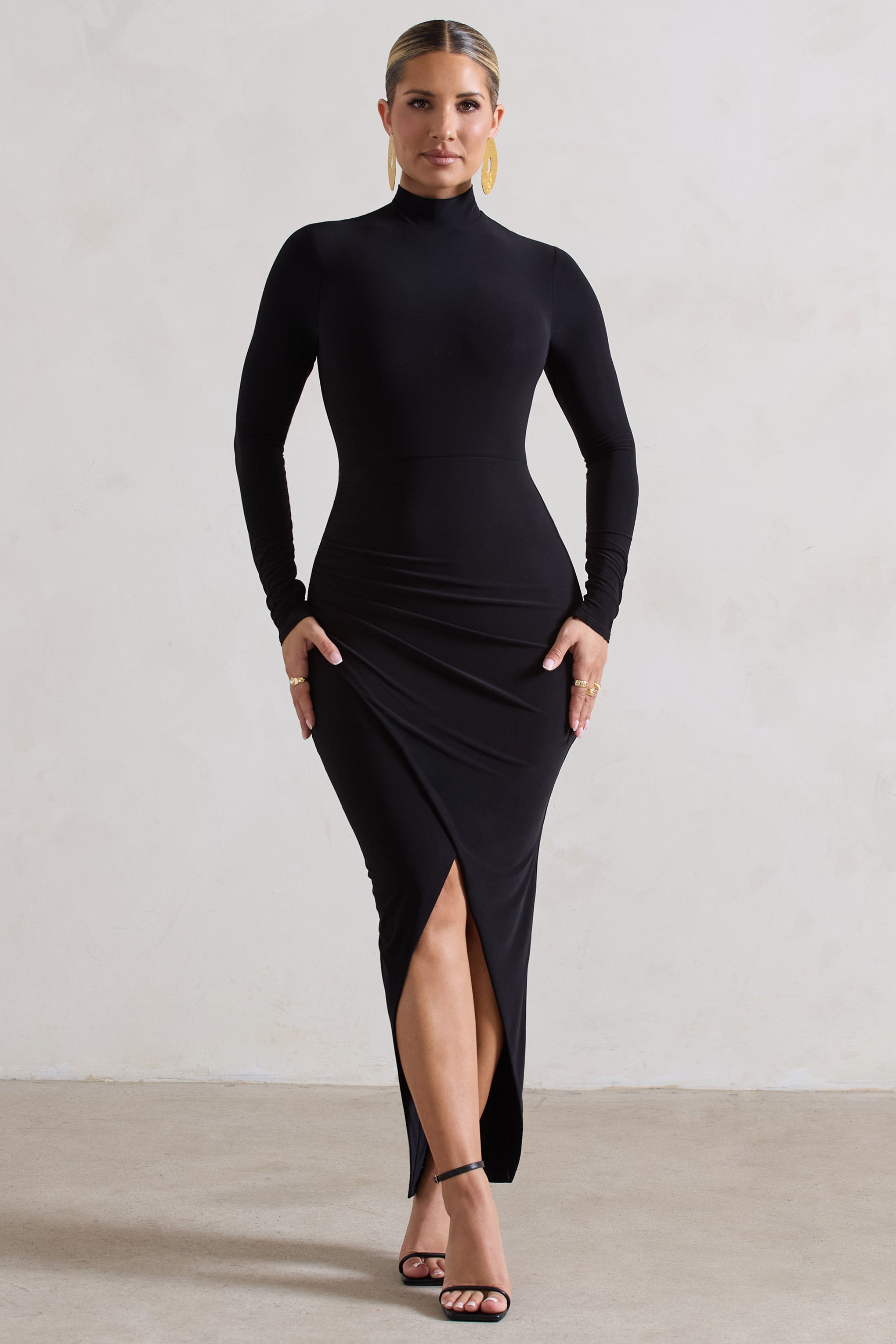 Sidnie Black Ruched Bodycon High-Neck Midi Dress