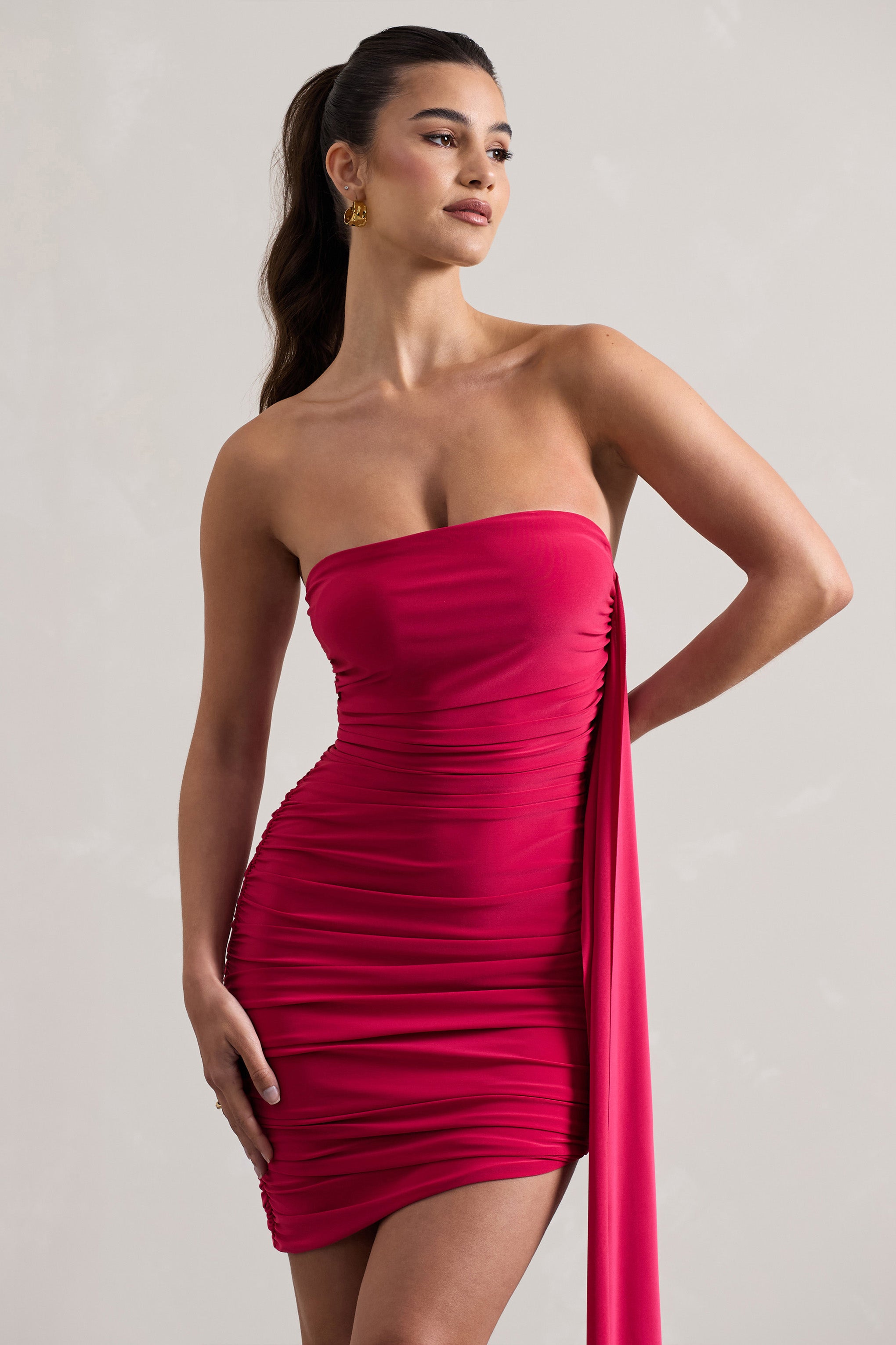 Siena Hot Pink Ruched Asymmetric Mini Dress With Sash