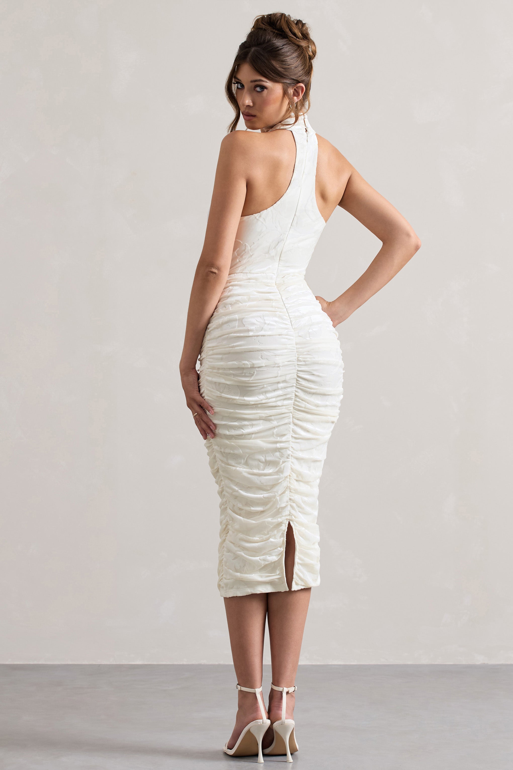 Therese White Ruched Bodycon High-Neck Midi Dress