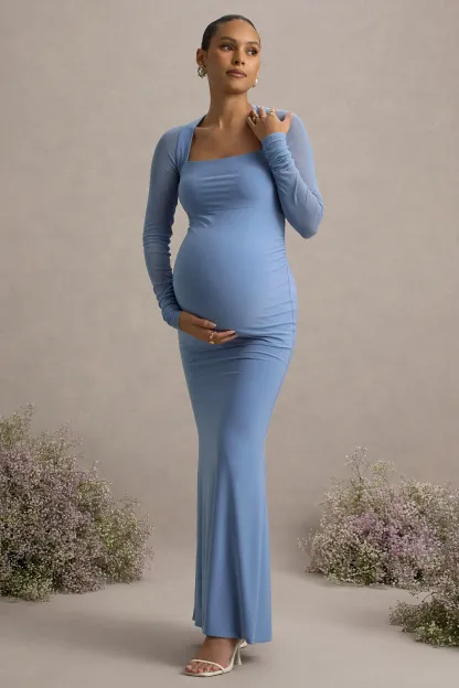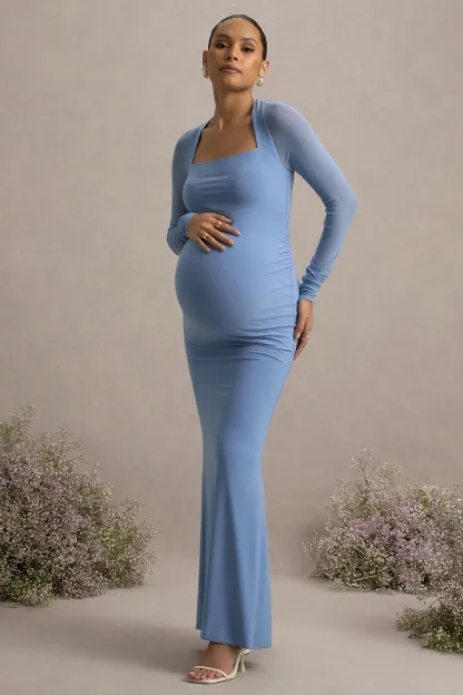 Powder Blue Maternity Maxi Dress With Sheer Sleeves