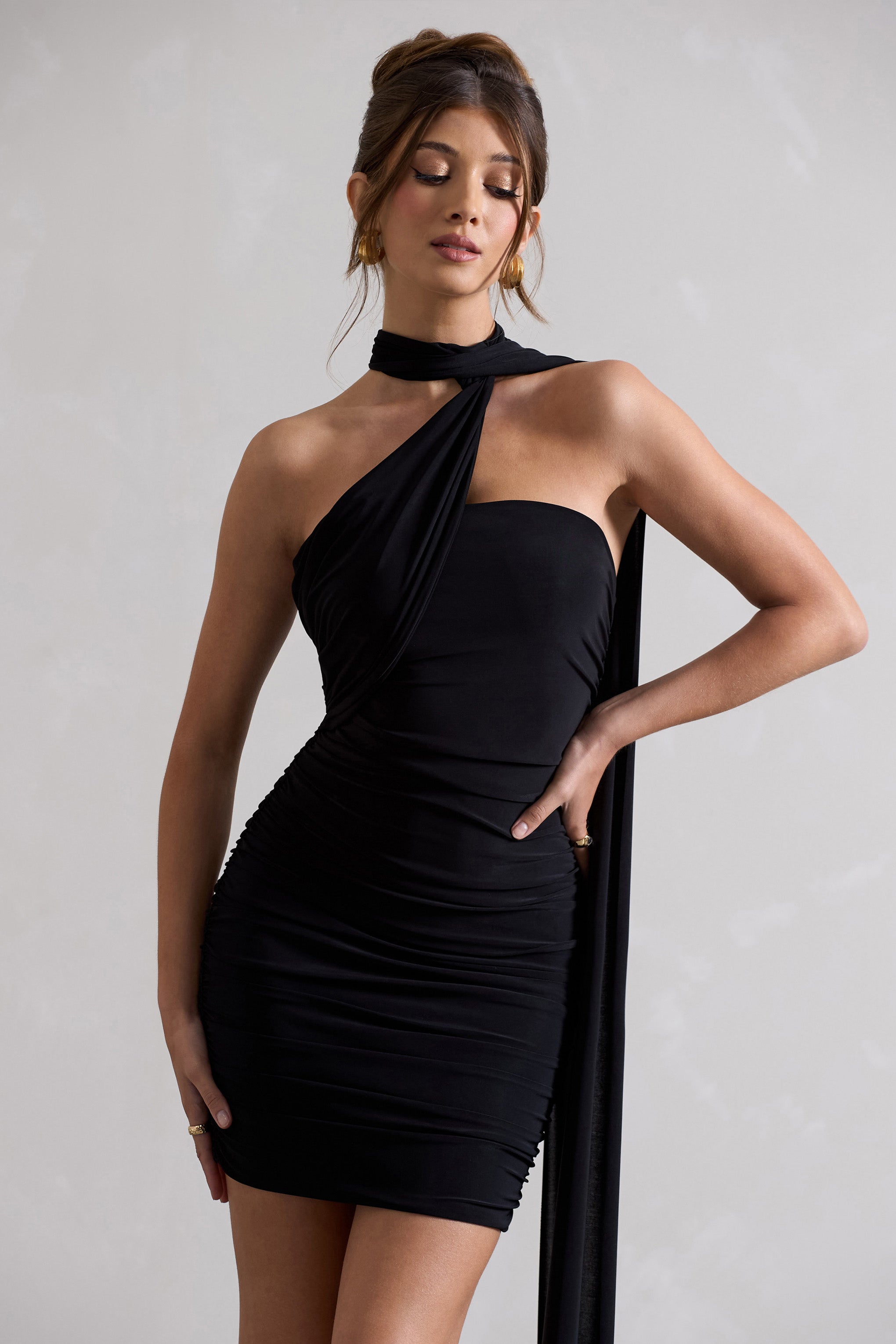 Abel Black Ruched One Shoulder Mini Dress With Scarf