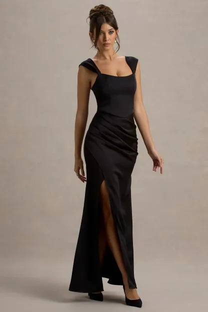 Defined by luxurious details that exude sophistication. Admire is your go-to for turning heads at your next special event. Crafted from our premium black stretch satin. this corset wrap maxi dress is designed to accentuate your curves with its structured bodice and figure-hugging silhouette. The elegantly draped wrap skirt flows into a sweeping hem. adding a touch of drama with every step.