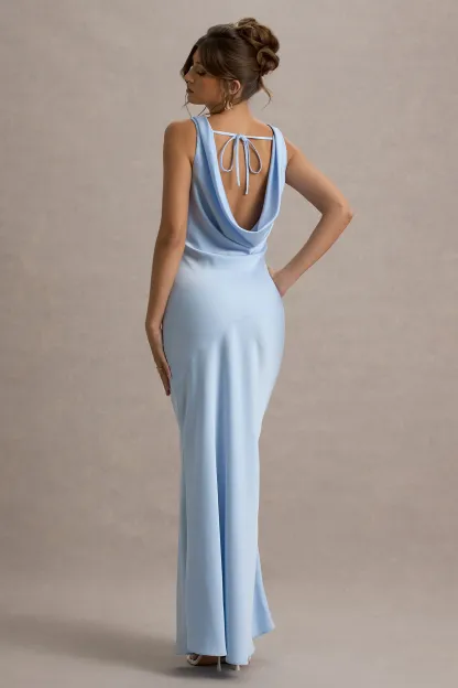 Powder Blue Satin Cowl-Neck Maxi Dress