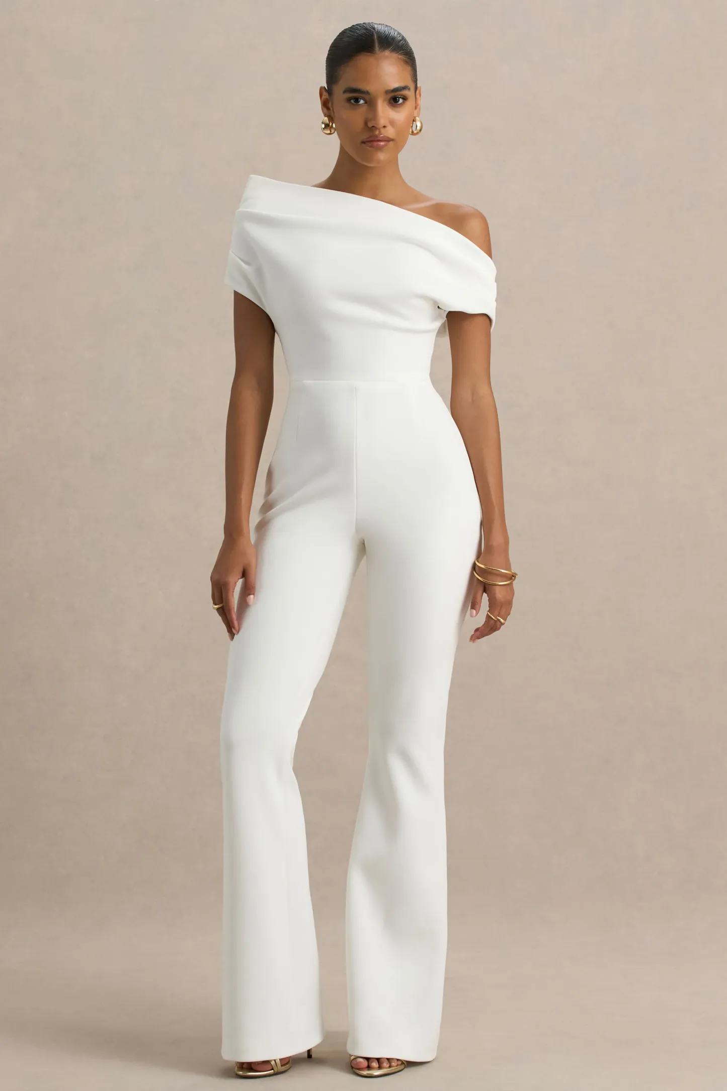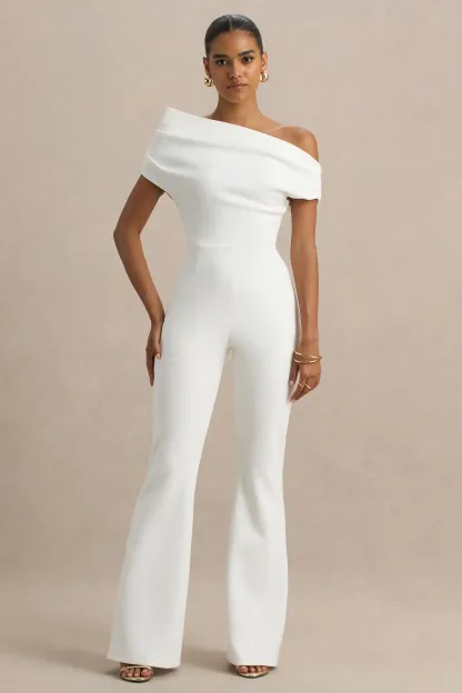 Tailored to perfection and designed to command attention. Alexandra is your go-to for powerful elegance. Crafted from our premium stretch crepe in a crisp white hue. this jumpsuit offers a flawless fit with a sleek. sculpted finish. The asymmetric neckline and draped detailing add a soft. feminine edge. perfectly balanced by the wide flared trouser that elongates your silhouette. Alexandra is sophistication with a statement twist. perfect for your next dressed up occasion.