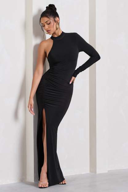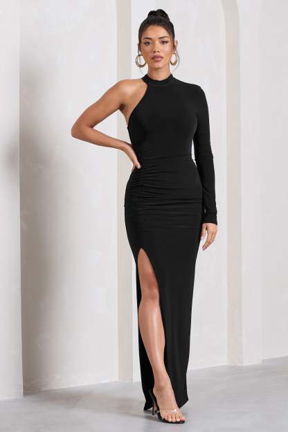 Alina Black Ruched High-Neck Asymmetric Split Maxi Dress