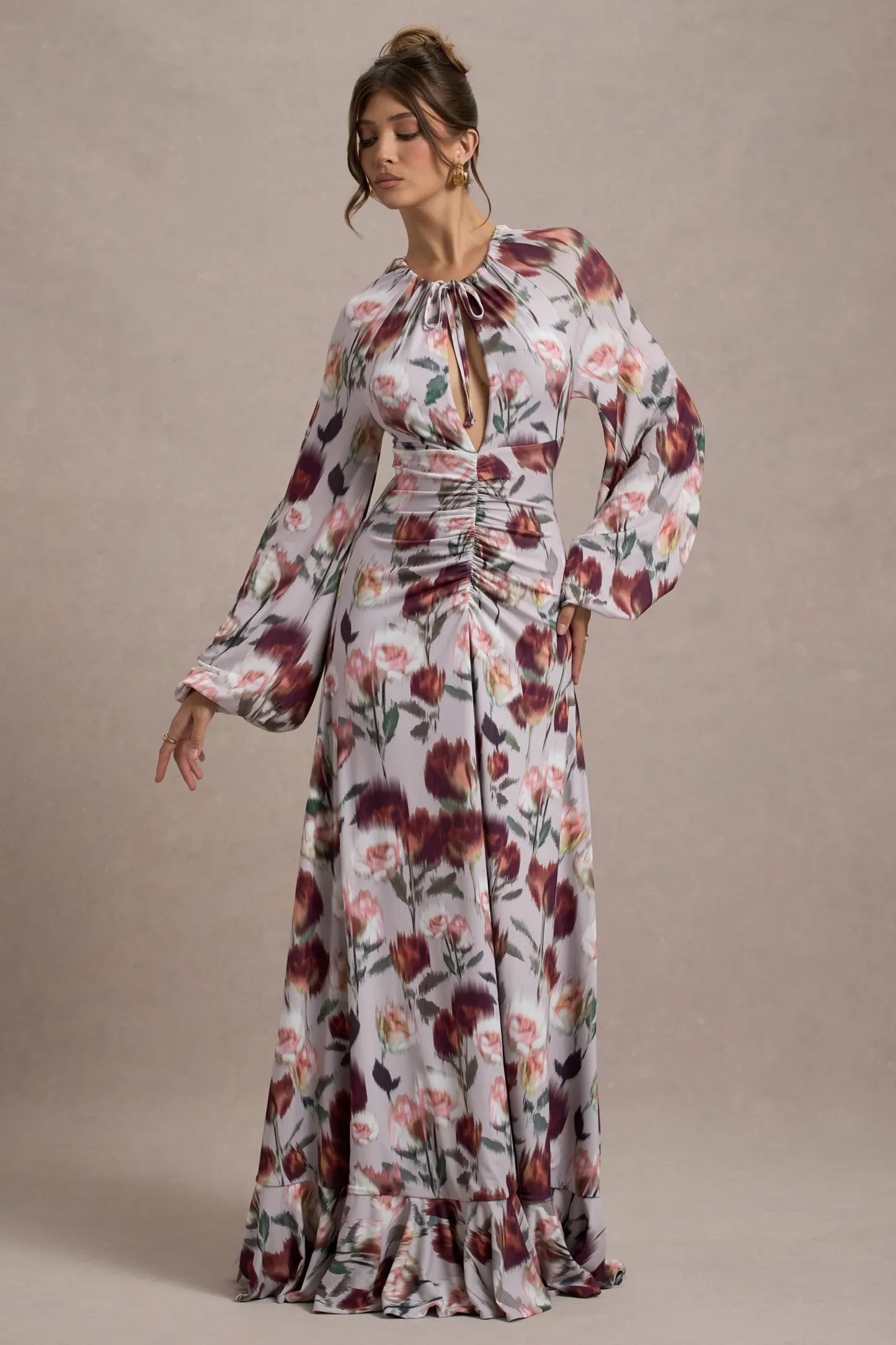 Adorned with soft romantic elements. allure in Althena. Crafted in a cream floral print of a premium solton. this billowy maxi dress is detailed by a self-tie neckline. blouson sleeves and contemporary keyhole cut-out. Complete with waist-cinching ruching. this floor-sweeper is a flattering choice for any special event.