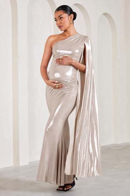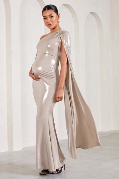 Amara Gold Metallic One-Shoulder Maternity Maxi Dress With Cape