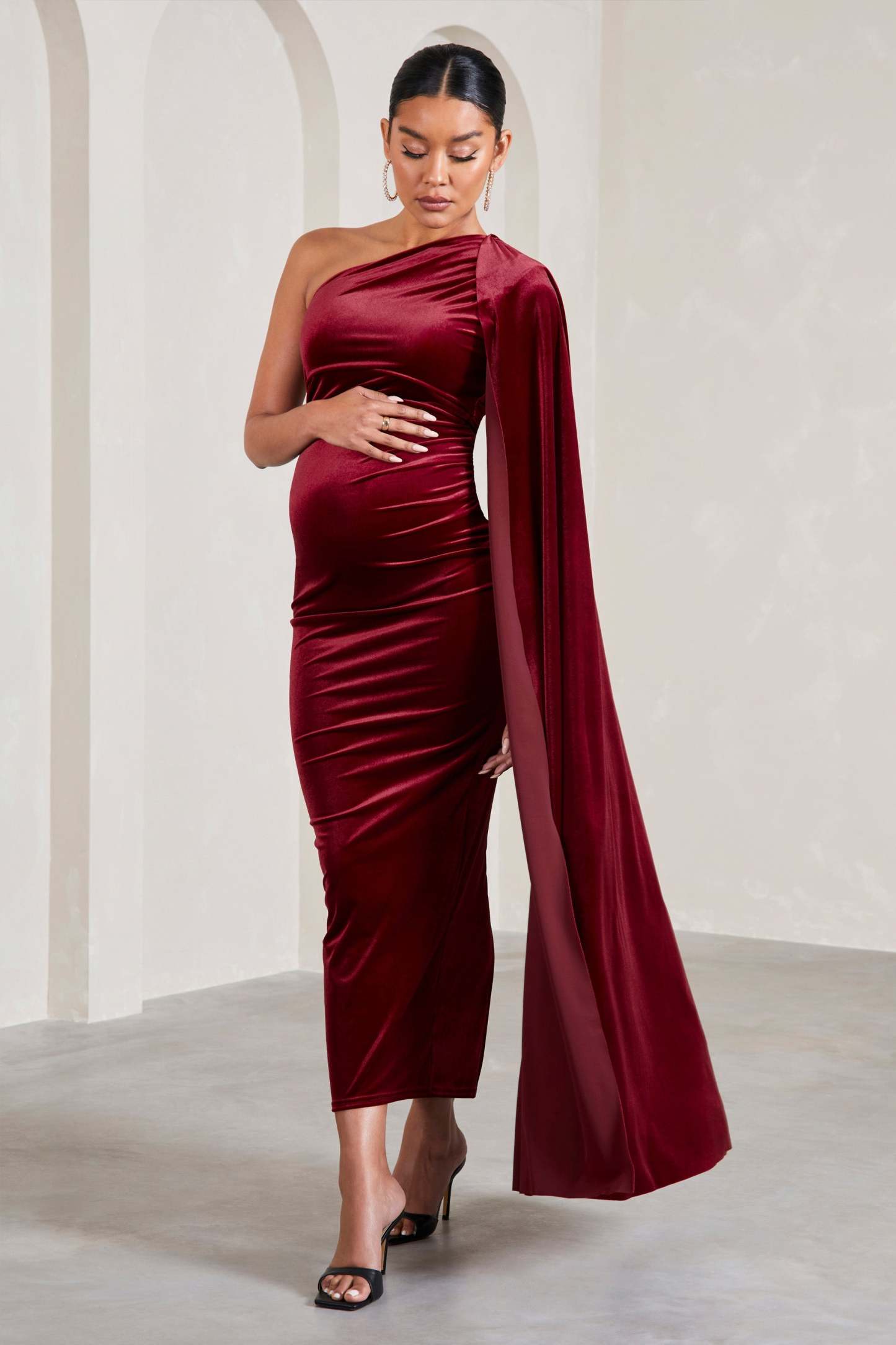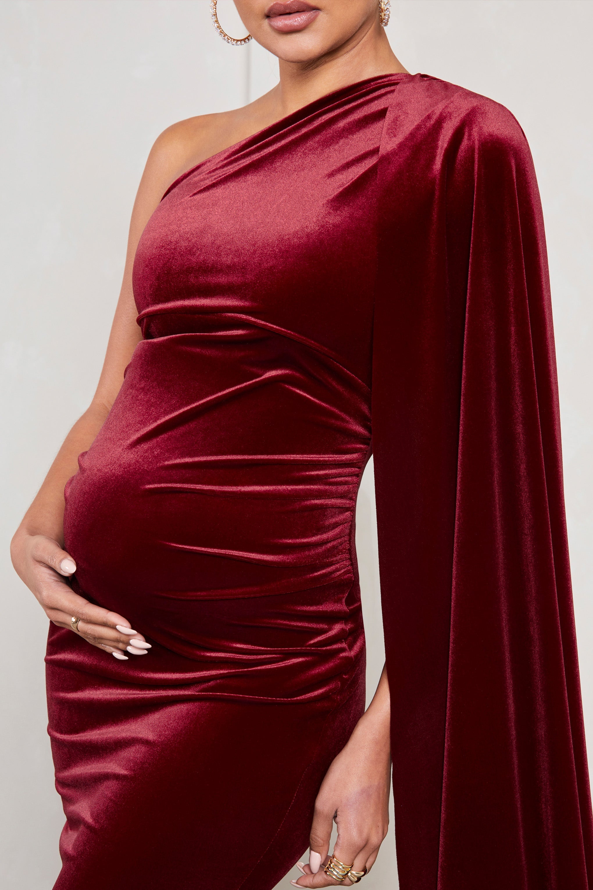 Amaryllis Berry Velvet Maternity One Shoulder Maxi Dress with Cape Sleeve