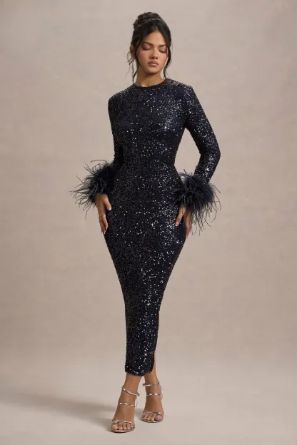 Navy Sequin Long-Sleeved Midi Dress With Feather Cuffs