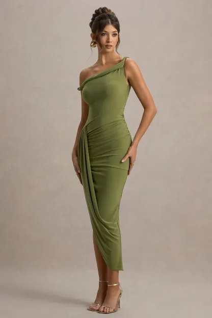 A classic choice for any event. Angelique. has just landed. Cut in our premium jersey in a stunning olive green hue. this piece showcases a gorgeous twisted neckline which transforms beautifully into an asymmetric hem. Style yours with stilettos for the perfect date night look or dress it down with flats for day drinks with the girls.