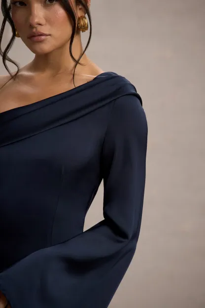 A wardrobe staple. Astral was designed to see you through any occasion. Expertly crafted in a rich navy hue of our premium satin. this free-flowing midi is defined by its asymmetric neckline and long. flared sleeves. Elevate yours with some bouncy curls and earrings like Cecille for the perfect formal look.