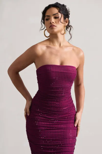 Dark Pink Embellished Bandeau Midi Dress