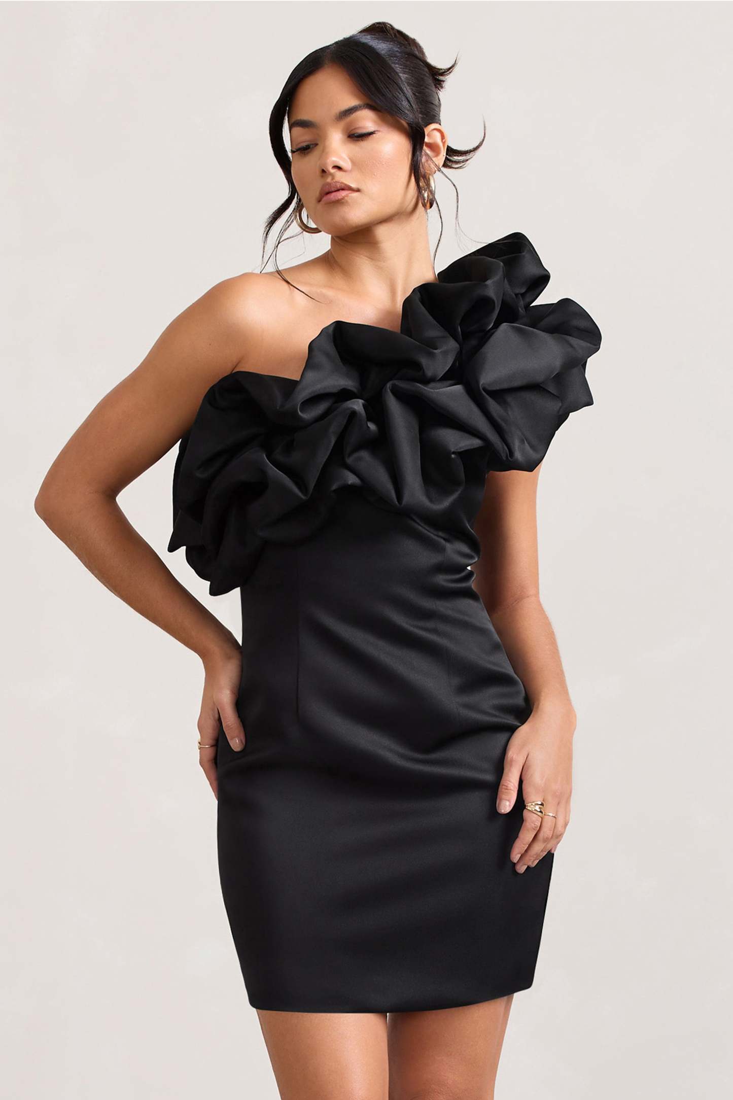 Our asymmetric mini dress At The Opera is characterised by an extravagant display of ruffles. Crafted in luxurious black satin. this figure-skimming piece is perfect for all black tie occasions. Try pairing this mini with a sleek bun to show off its statement neckline.