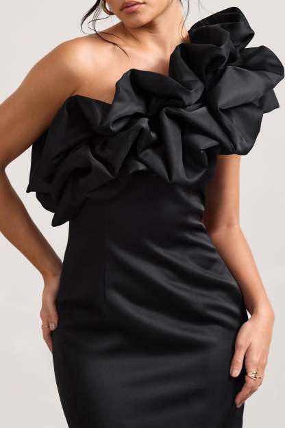 At The Opera Black Satin One Shoulder Ruffled Mini Dress