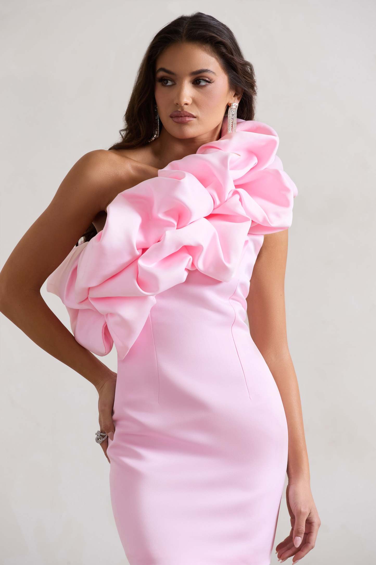 Our asymmetric mini dress At The Opera is characterised by an extravagant display of ruffles. Crafted in luxurious pink satin. this figure-skimming piece is perfect for all black tie occasions. Try pairing this mini with a sleek bun to show off its statement neckline.