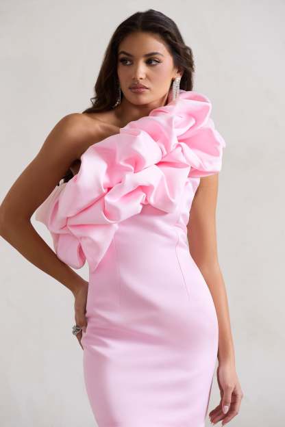 At The Opera Pink Satin One Shoulder Ruffled Mini Dress