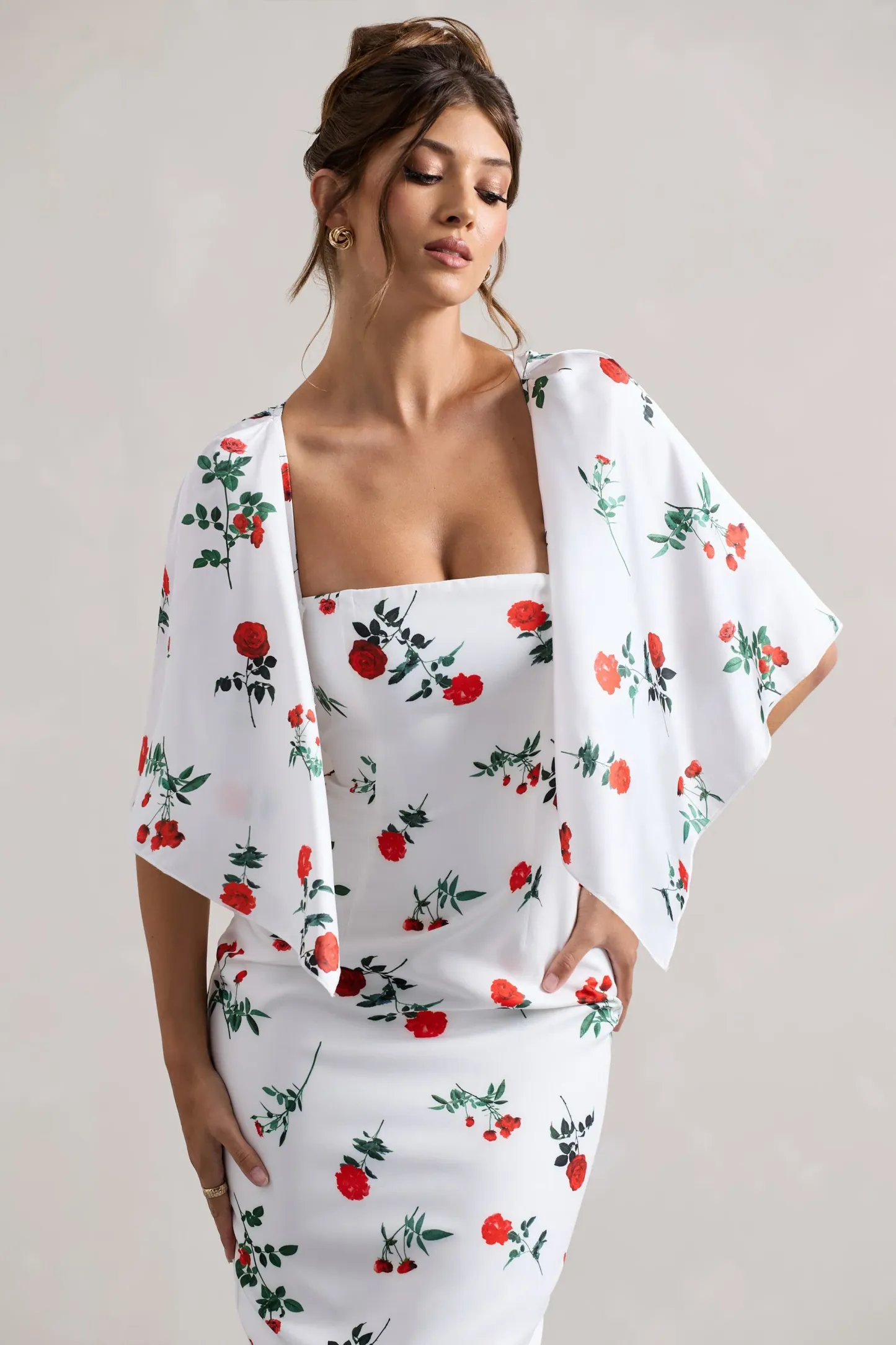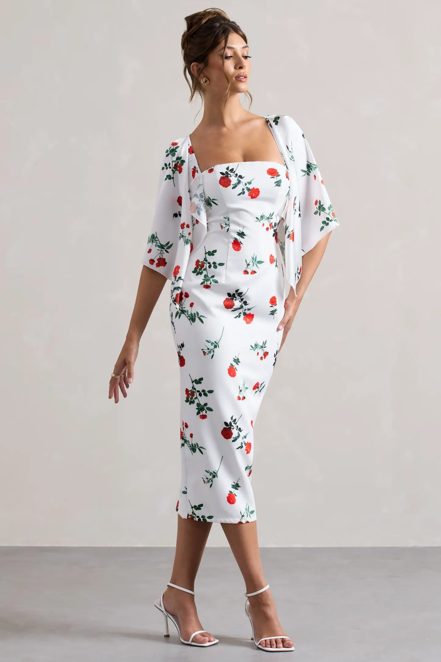 True to its name our Bonita midi dress boasts beautiful feminine charm. Crafted in a premium crepe in a blissful rose print with elegant satin cape sleeves. Style this stunning midi dress with a tousled bun for the ultimate occasion look.