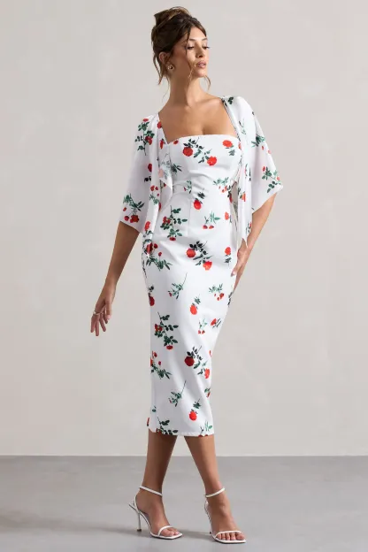 Rose Print Cape-Sleeve Midi Dress
