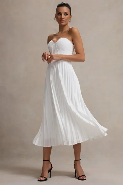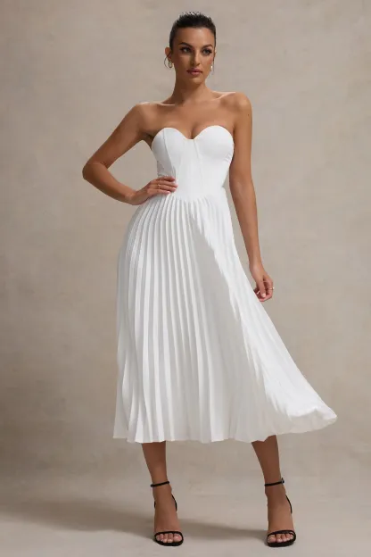 Encapsulate elegance in Bordeaux. our cream midi dress. This dress expertly cut in a premium satin creates a sophisticated feminine silhouette. with a sweetheart neckline and flattering structured corset bodice. the pleated skirt creates a romantic sense of movement. Style Bordeaux with our Hear Me court heels and a sleek bun for a classic look at your next occasion.