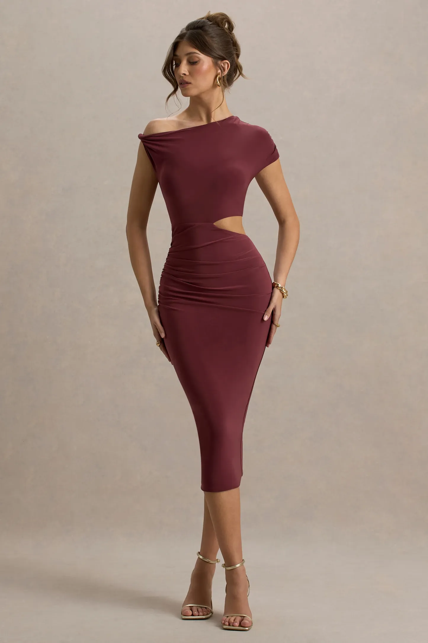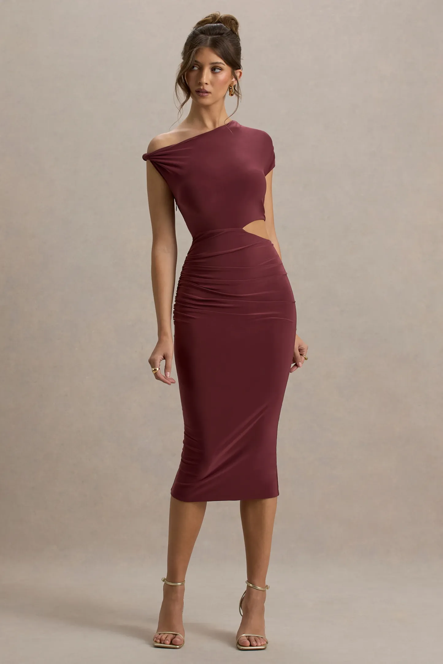 Whether its a romantic date night at your favourite restaurant or girls night out. captivate in Calliope. Carefully crafted in our curve-enhancing jersey. this burgundy midi dress is defined by an artful twisted strap. single short sleeve and flattering waist cut-out. Elevate yours further by complimenting Calliope with some court heels like Blade.