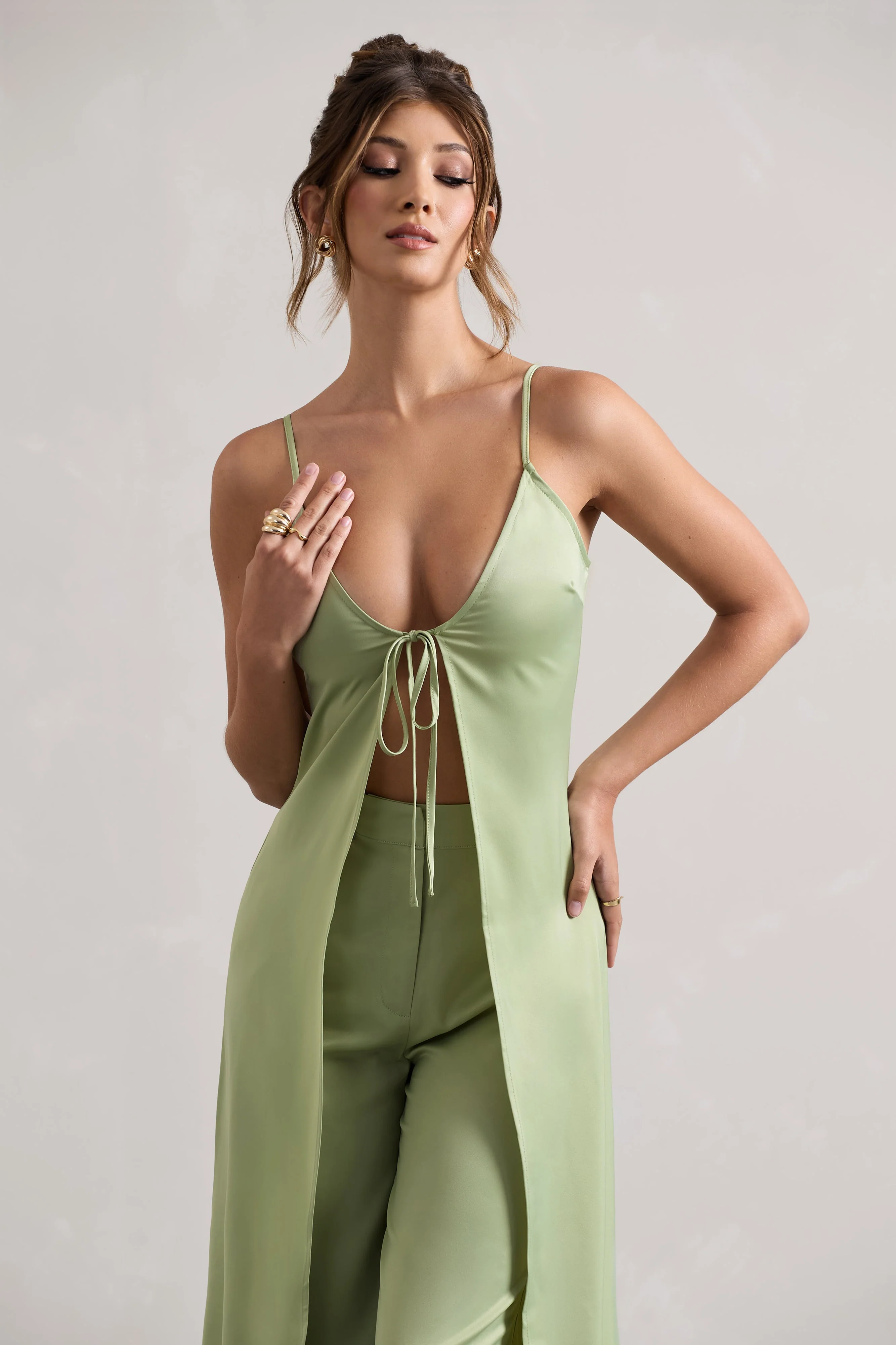 Crafted in our signature silky satin in a pale green. Calvi is a statement piece for any event. Boasting adjustable cami straps and a self-tie front for a custom fit. style yours with our Your Way trousers for a match made in heaven.