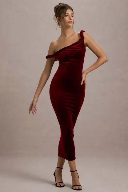 Defined by its luxurious texture and contemporary design. Carella is a striking choice for your next evening event. Crafted from our premium berry velvet. this midi dress features a twisted front detail that accentuates your waist and an asymmetric hemline that adds a touch of modern drama. The rich velvet fabric enhances your silhouette. while the unique neckline brings an elevated elegance to the look. Keep Carella in the spotlight with sleek stilettos and minimal jewelry. finishing the ensemble with a chic clutch and a soft wave in your hair for an effortlessly sophisticated finish.