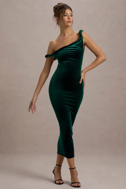 Bottle Green Velvet Twisted Asymmetric Midi Dress