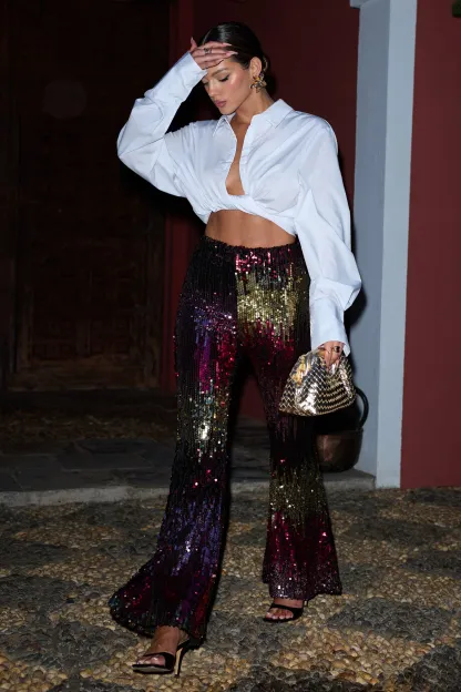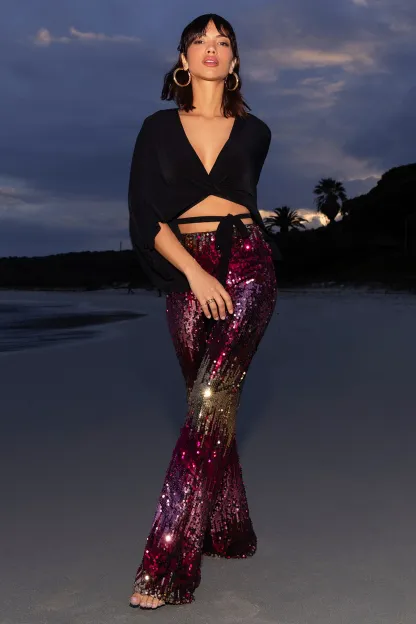 Designed to dazzle. our Carnival trousers are perfect for the upcoming festival season. Saturated in a pink and gold pattern of shimmering sequins. keep these flared-leg trousers at the forefront by styling yours with a black top like Scorpio.
