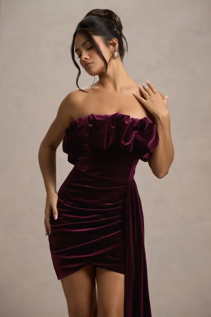 Plum Velvet Bandeau Mini Dress With Drape