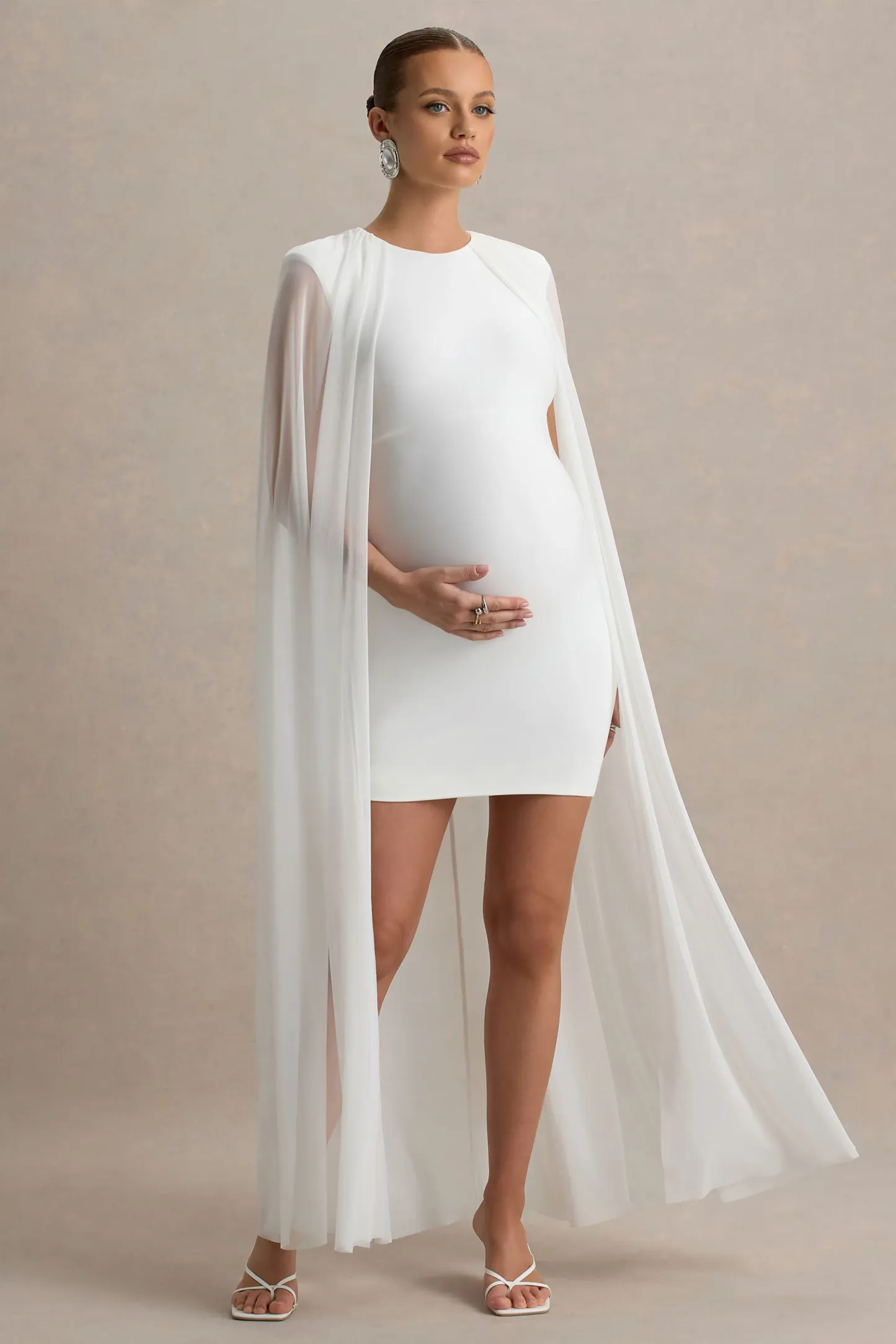 White High-Neck Maternity Mini Dress With Mesh Cape
