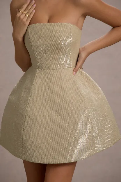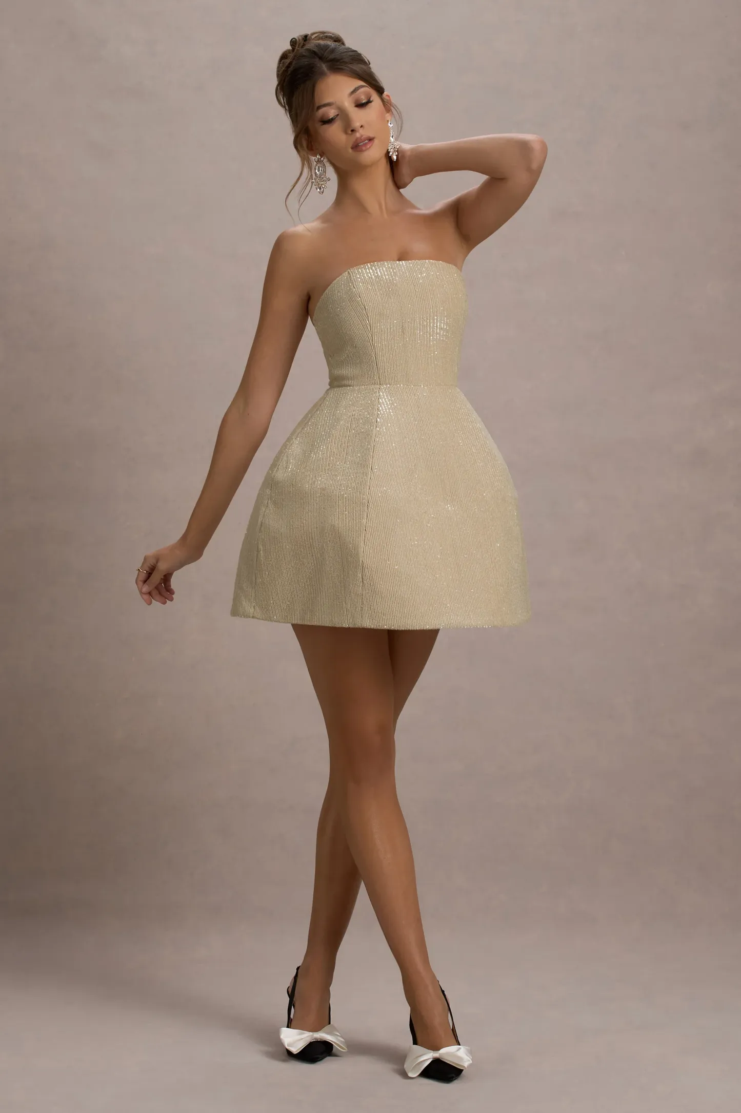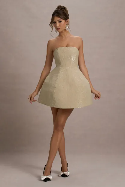 If you're looking for an entrance making dress. Clarabell is it. Expertly designed in a shimmering structured silhouette of cream sequins. this strapless mini was made to step out into the spotlight. Keep Clarabell at the forefront of your next party with some stilettos like Sweet Step.