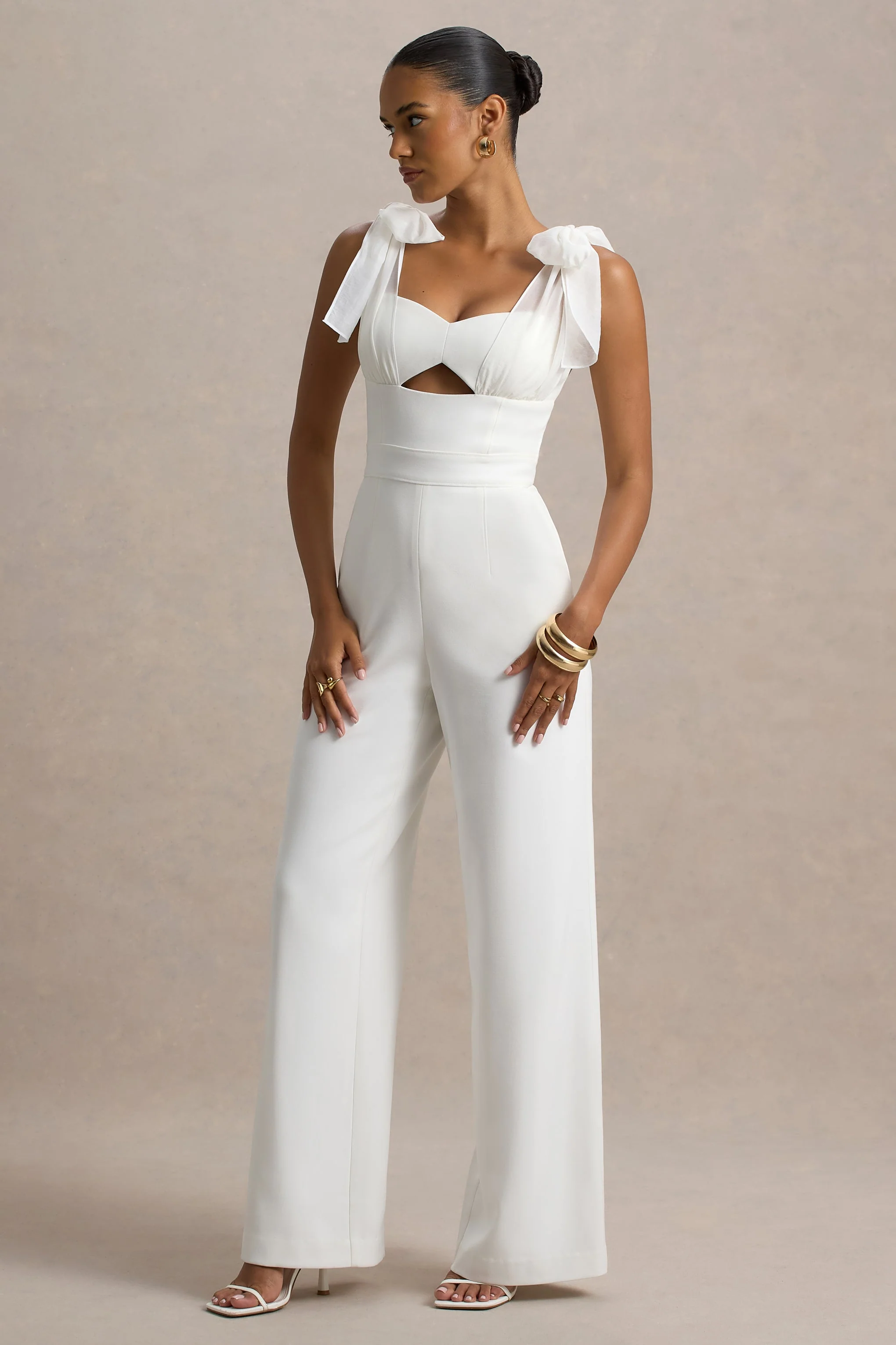 Playful yet elegant. our Claudelle jumpsuit is the perfect way to make a bold entrance. Curated in a classic white hue of our premium stretch crepe. this one-piece sculpts your curves whilst enhancing your silhouette. The sweetheart neckline adds chic femininity to this structure piece. whilst the chest cut-out adds a daring edge . The delicate organza bow sleeves complete this look with an effortlessly romantic feel. Style Claudelle with sleek heels and gold accessories for your next special occasion.