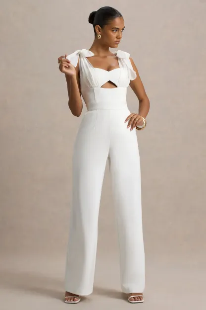 White Flared-Leg Jumpsuit With Organza Bow Straps