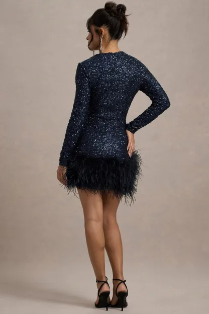 Navy Sequin High Neck Feather Hem Mini Dress With Long Sleeves
