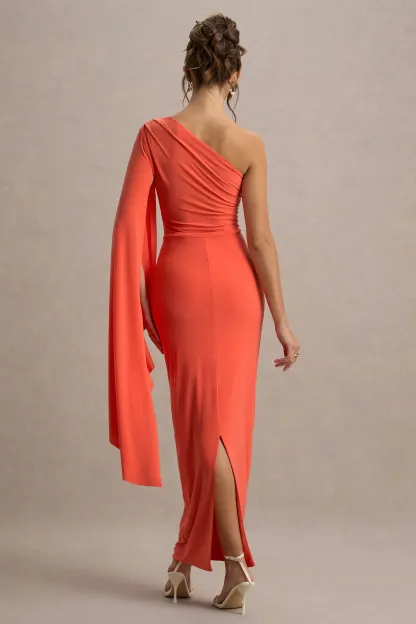 Characterized by its romantic flair and graceful design. Clementina is an exquisite choice for your next special event. Draped in an orange shade. this maxi dress is crafted from premium jersey for a soft. flattering fit. The asymmetric cape sleeves add a touch of whimsical elegance. while the flowing silhouette creates a timeless. ethereal appeal. Perfect for garden parties or evening soirees. let Clementina take centre stage with simple jewellery and understated heels for a look that's effortlessly enchanting.