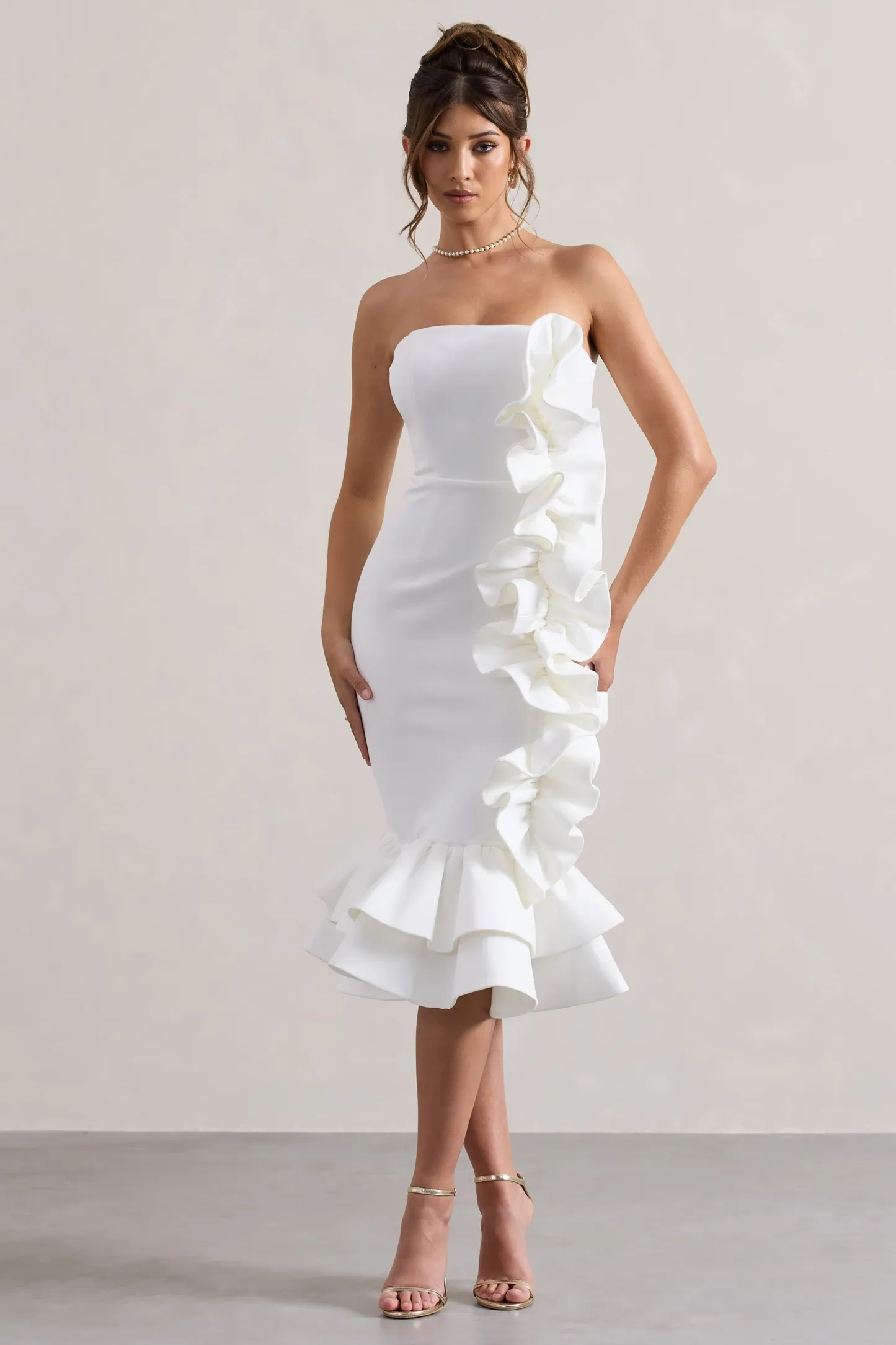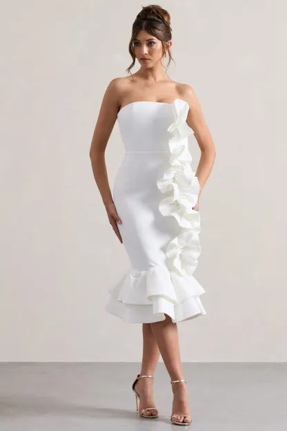 A perfect occasion piece. this opulent midi is a must-have for any upcoming special event. Crafted in a crisp cream shade of our premium stretch crepe. this strapless style is defined by an eye-catching ruffle that flows down your silhouette. Complete with a layered hemline. compliment Concept with some statement stilettos during your next race day.