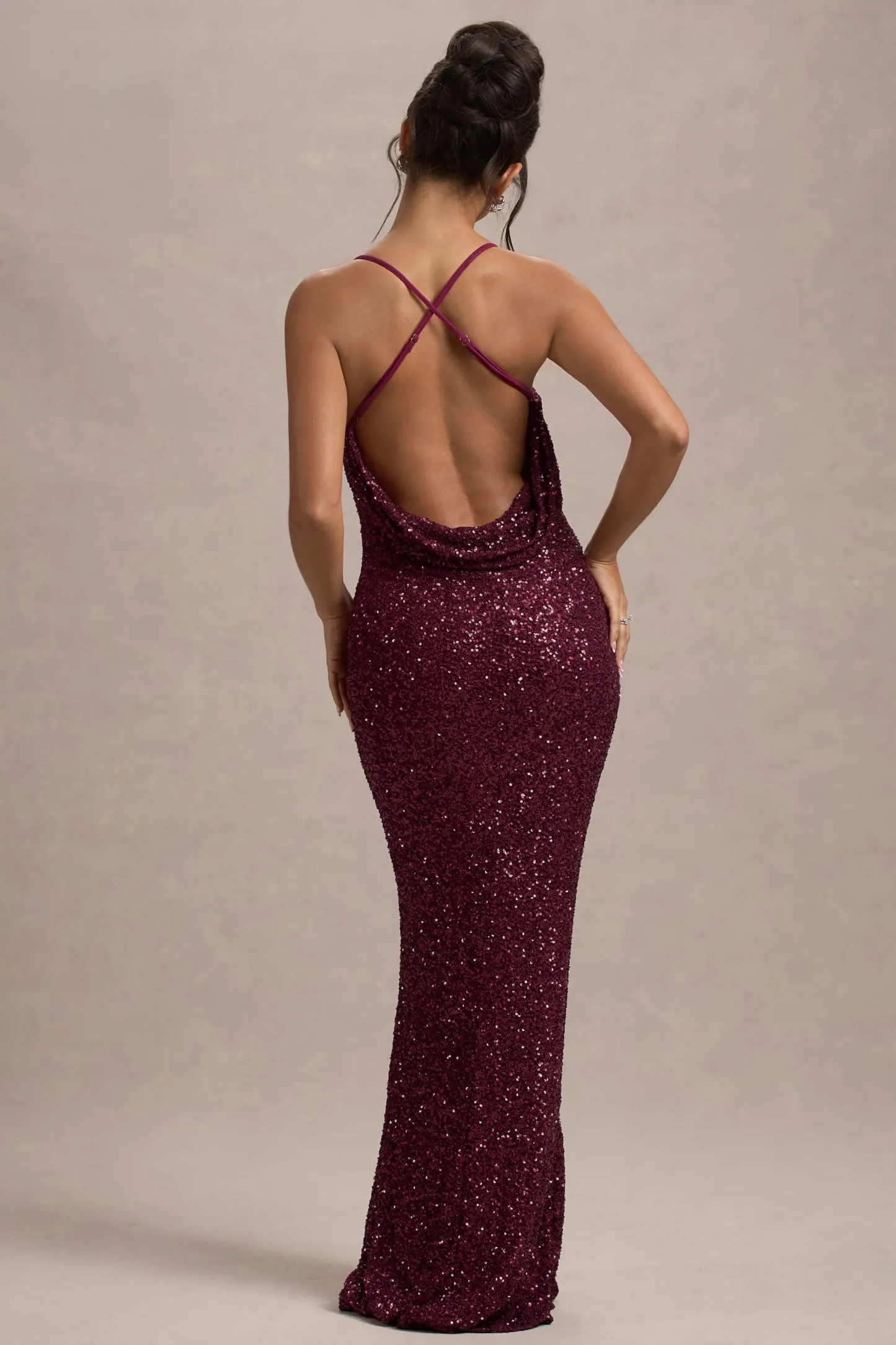 Set the sparkle standard at your next event in Cosmic. our statement maxi dress. Designed in light-catching berry sequins that sparkle as you move. this maxi is defined by its strappy open back and tantalising cowl detail. Keep Cosmic at the forefront this event season and pair yours with a sleek bun and some complimenting gold accents.