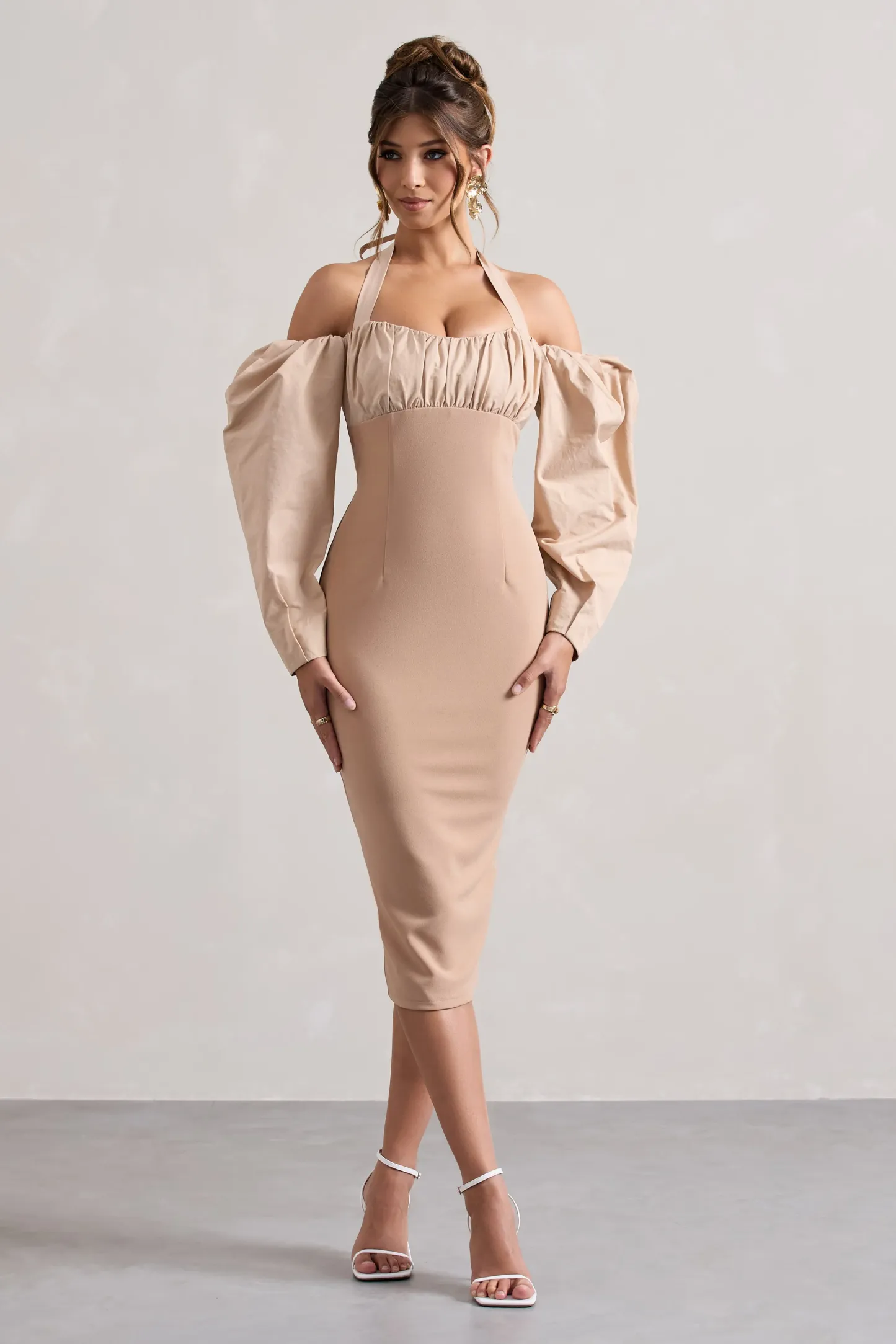 Champagne Halter-Neck Puff Sleeve Midi Dress