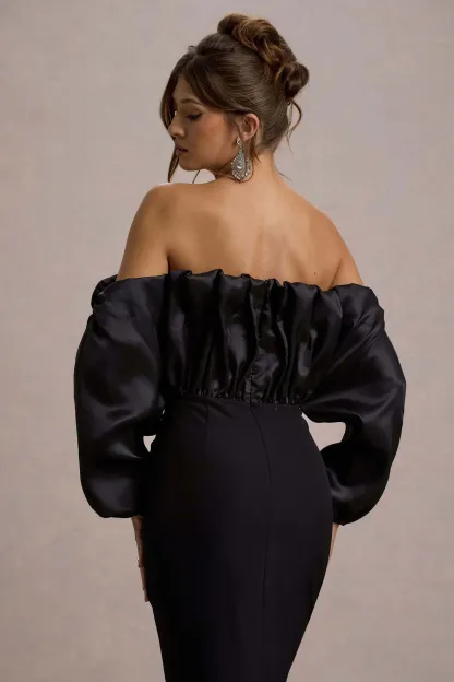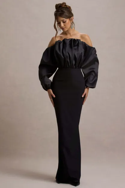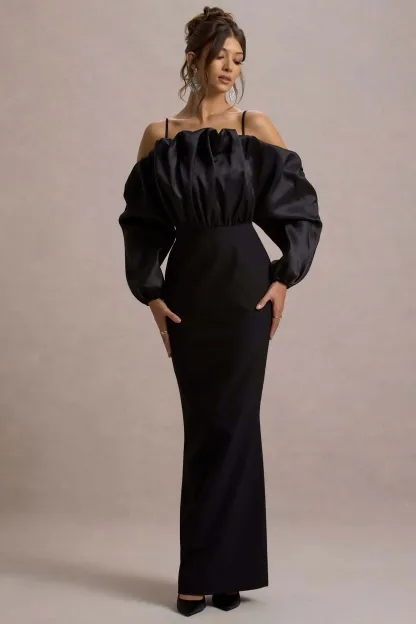Irresistibly captivating. go for maximum impact with Cyrene. Ruffled to perfection in a floor-length silhouette of crepe. this black maxi dress boasts an off the shoulder neckline equipped with detachable straps for extra support. For an elegant black tie look. style yours with some sparkling accents like Lumina.